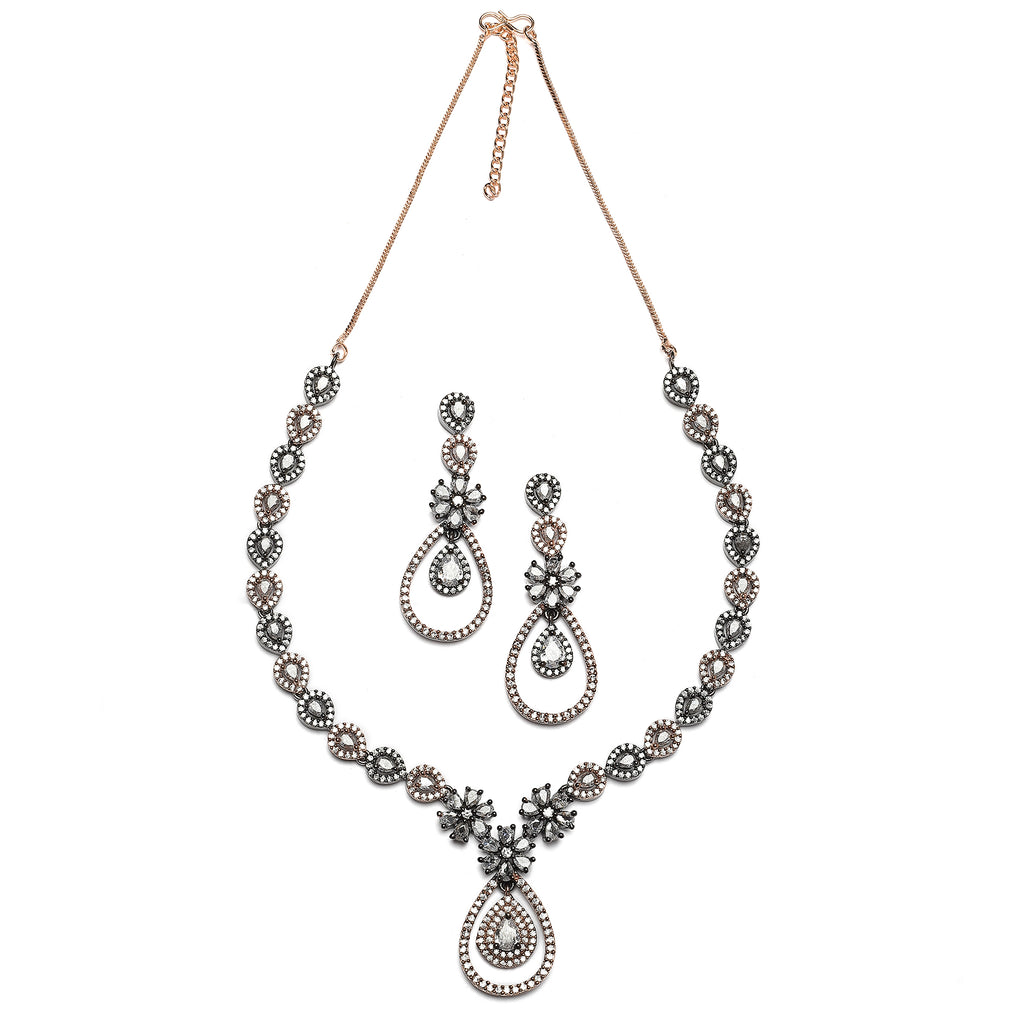 This jewellery set consists of a necklace and a pair of earrings. Rose Gold-Plated Gunmetal Toned white american diamond studded teardrop & floral shaped collar necklace, has secured with a s-hook closure. A pair of matching drop earrings, each secured with a post and back closure.