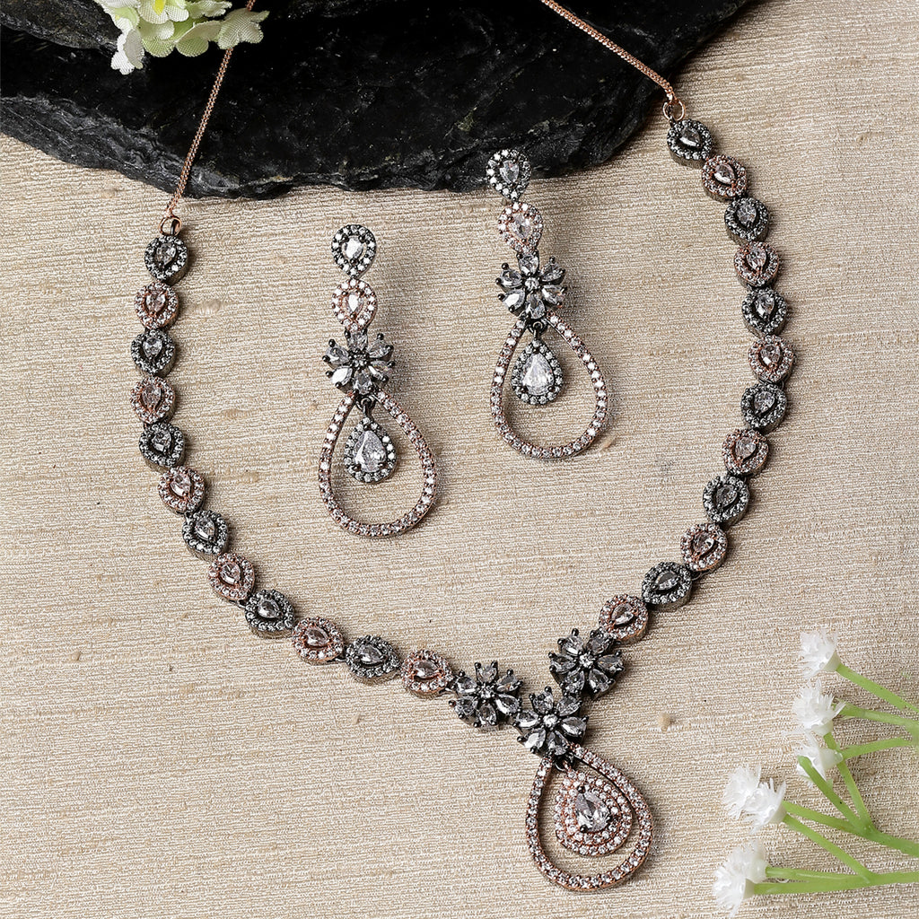 Rose Gold-Plated Gunmetal Toned White American Diamond Studded Teardrop & Floral Shape Jewellery Set