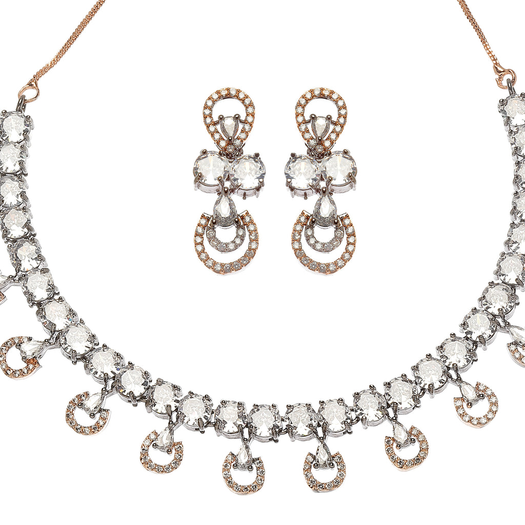 Rose Gold-Plated Gunmetal Toned White American Diamonds Studded Contemporary Necklace & Earrings Jewellery Set