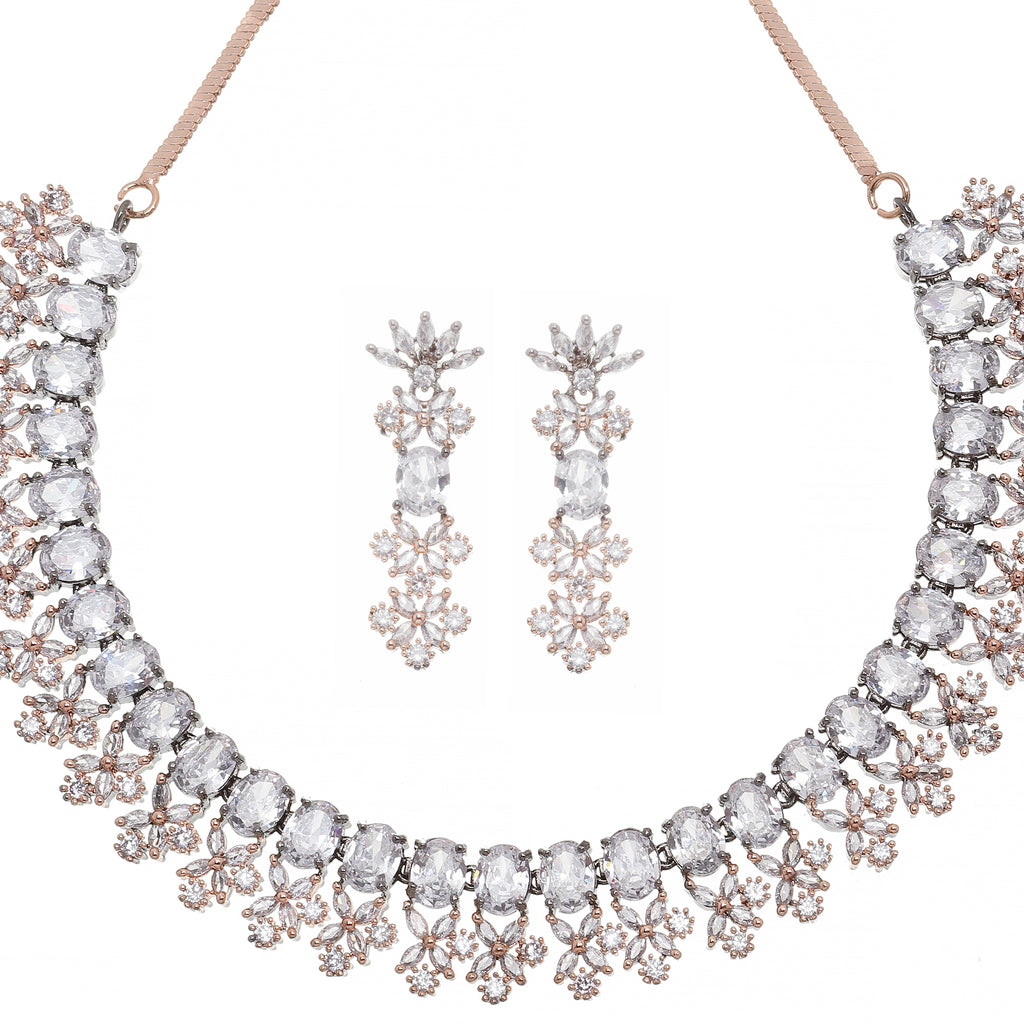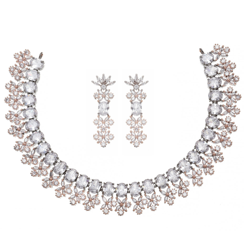Rose Gold-Plated Gunmetal Toned White American Diamonds Studded Wacky Necklace & Earrings Jewellery Set