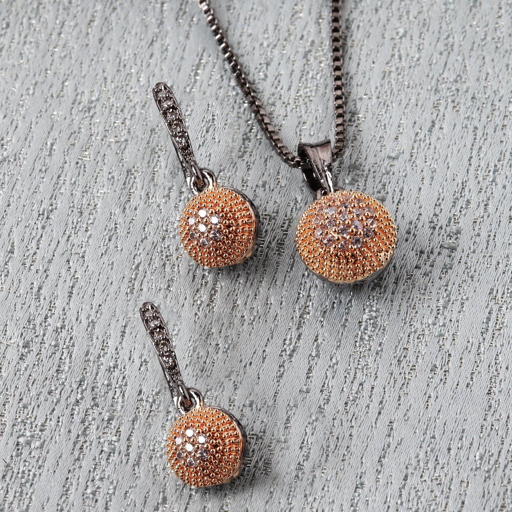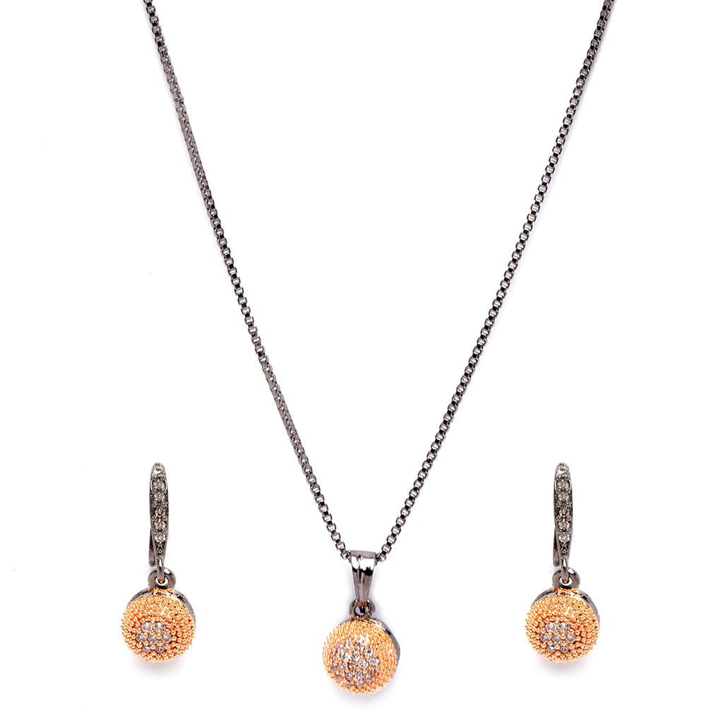 This jewellery set consists of a pendant and a pair of earrings. Rose Gold-Plated Gunmetal Toned white cubic zirconia studded round shaped cute pendant, secured with s-hook closure. A pair of matching drop earrings, each secured with a post and back closure.