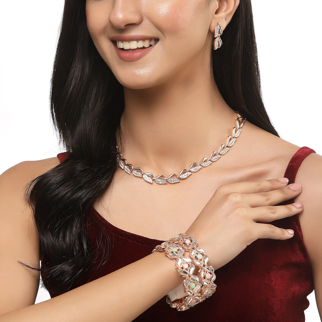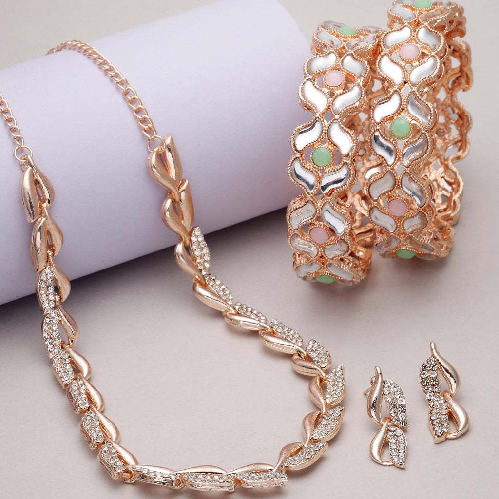 Rose Gold Plated Leaf Pink & Sea Green Cubic Zirconia Studded Combo - Necklace, Earrings, Bangles