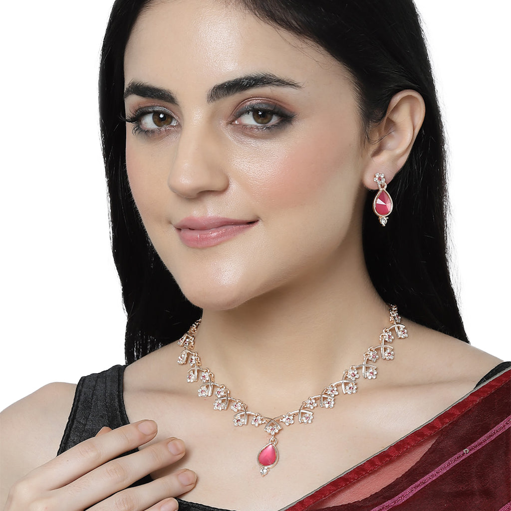 Rose Gold-Plated Pink Cubic Zirconia Studded Teardrop Shaped Necklace with Earrings Jewellery Set