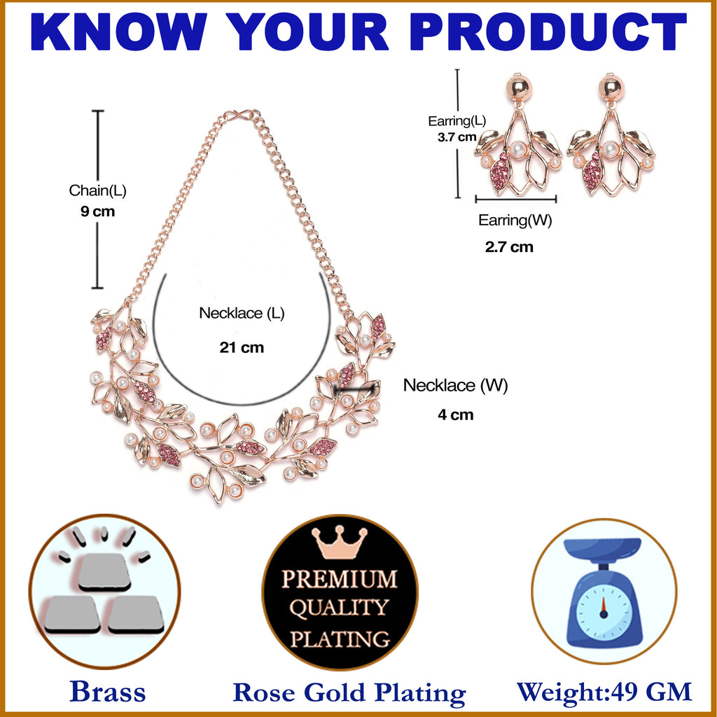 Rose Gold-Plated Pink Cubic Zirconia & White Pearls Studded Leaf Shaped Necklace with Earrings Jewellery Set
