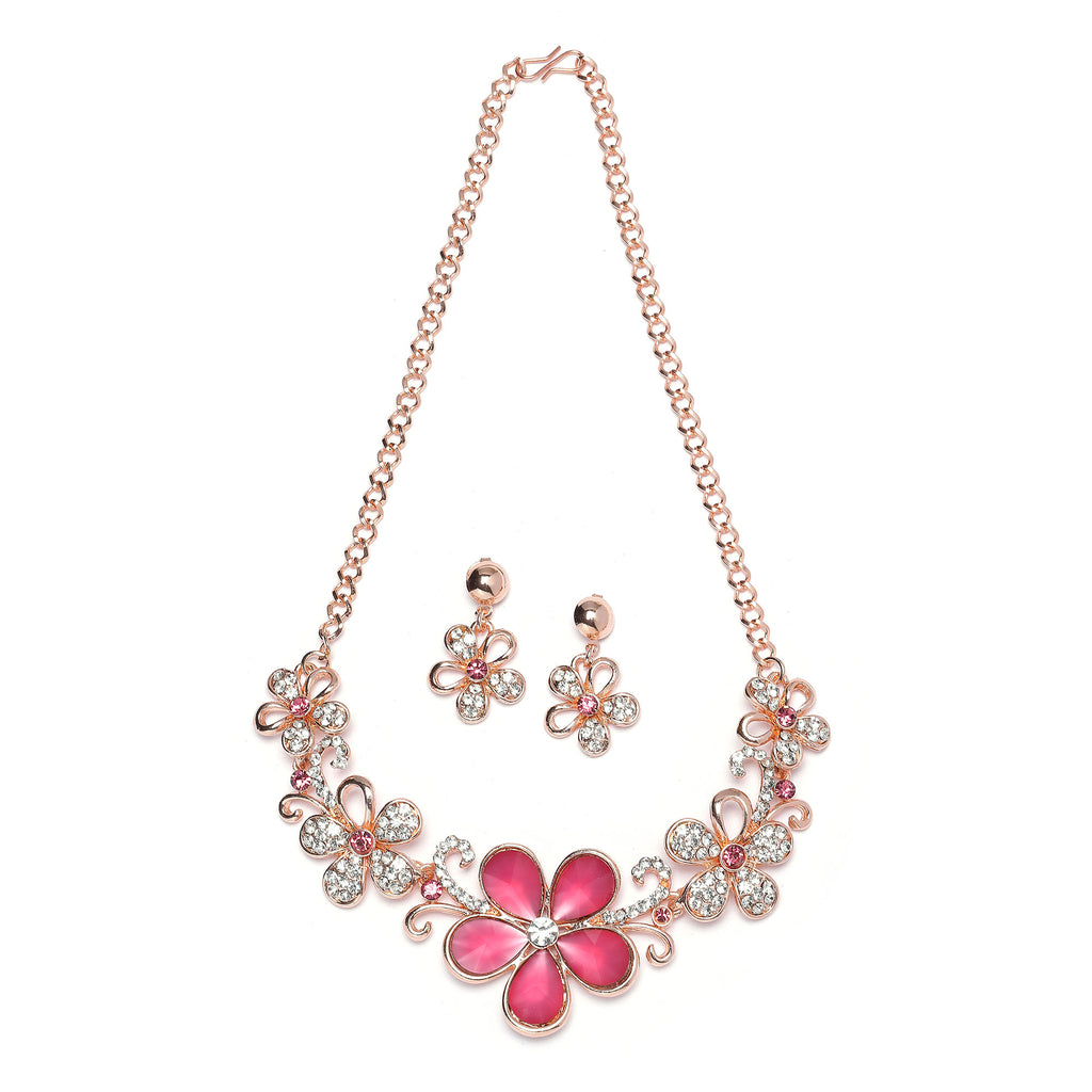 Rose Gold-Plated Red American Diamonds Studded Floweret Necklace & Earrings Jewellery Set