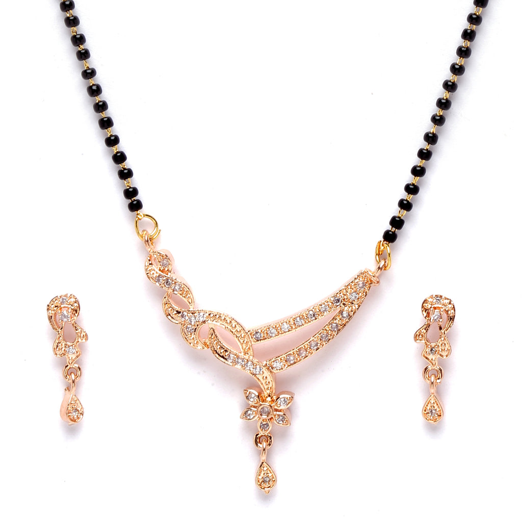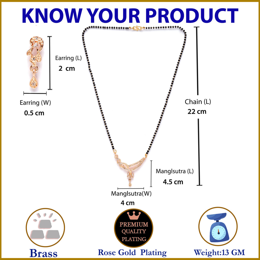 Rose Gold-Plated Mangalsutra with Earrings, has White American Diamond Studded & Black Beads Beaded details, secured with S-Hook closure. A Matching pair of Drop Earrings, each secured with Post and Back closure.