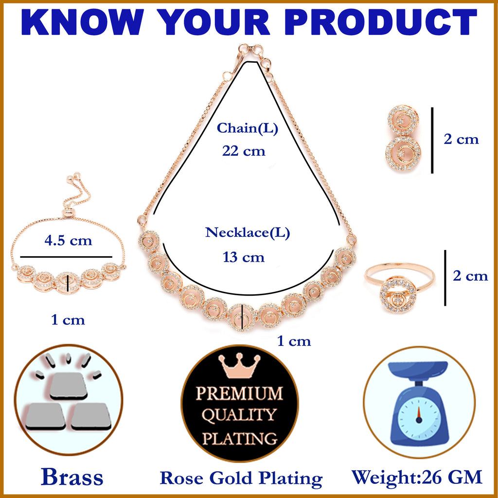 This jewellery set consists of a necklace, a pair of earrings, a ring and a bracelet. Rose Gold-Plated white american diamond studded circular shape necklace, has secured with s-hook closure. A pair of matching drop earrings, each secured with a post and back closure. A mataching ring, secured with adjustable closure. A matching bracelet, secured with adjustable drawstring closure.