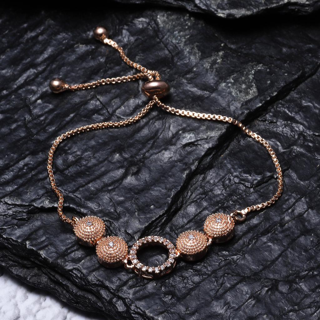Elegant Design – This rose gold-plated bracelet features a circular-shaped charm at the center, beautifully surrounded by intricately designed textured spherical beads for a sophisticated and stylish look.