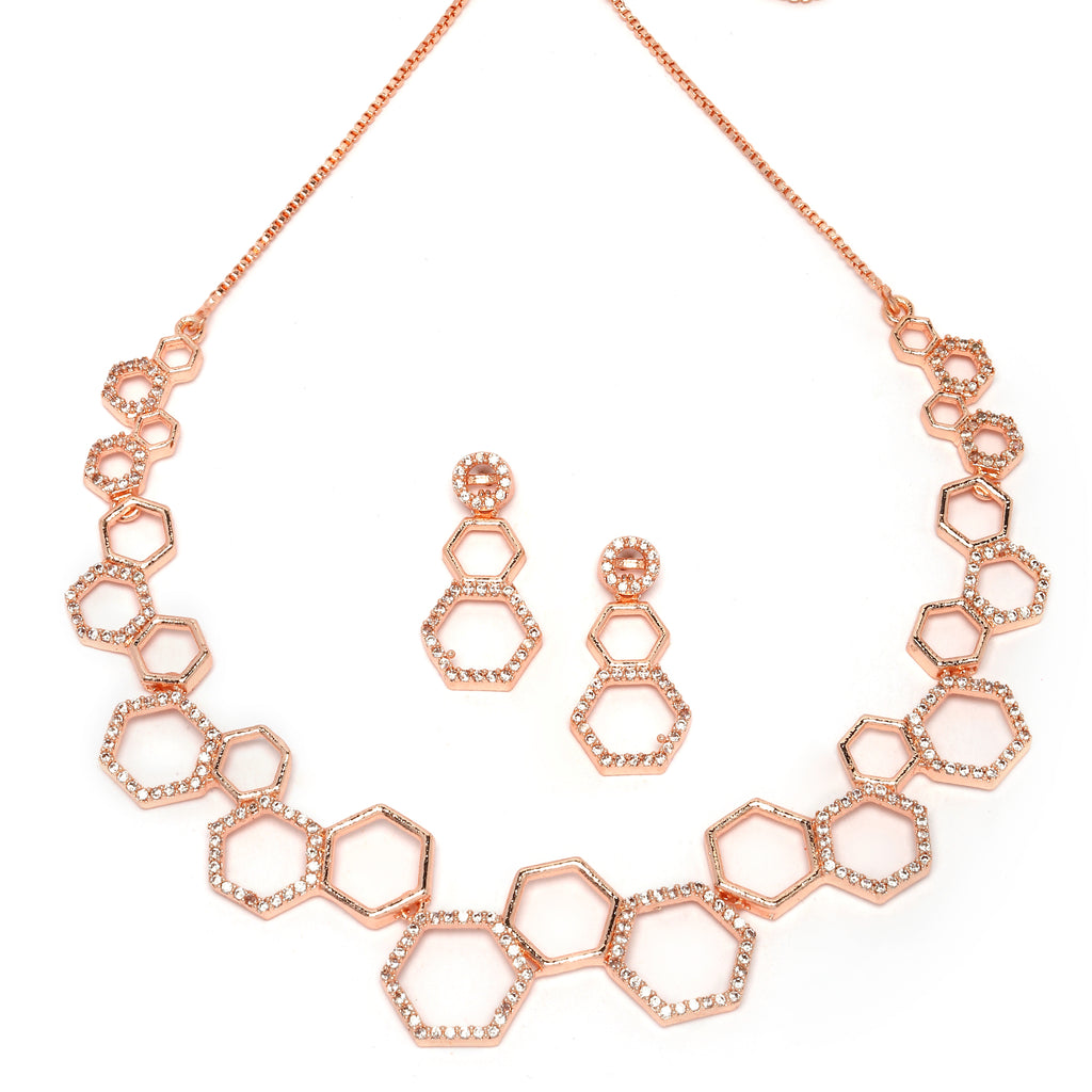 Rose Gold-Plated White American Diamond Studded Hexagon Shaped Necklace with Earrings Jewellery Set