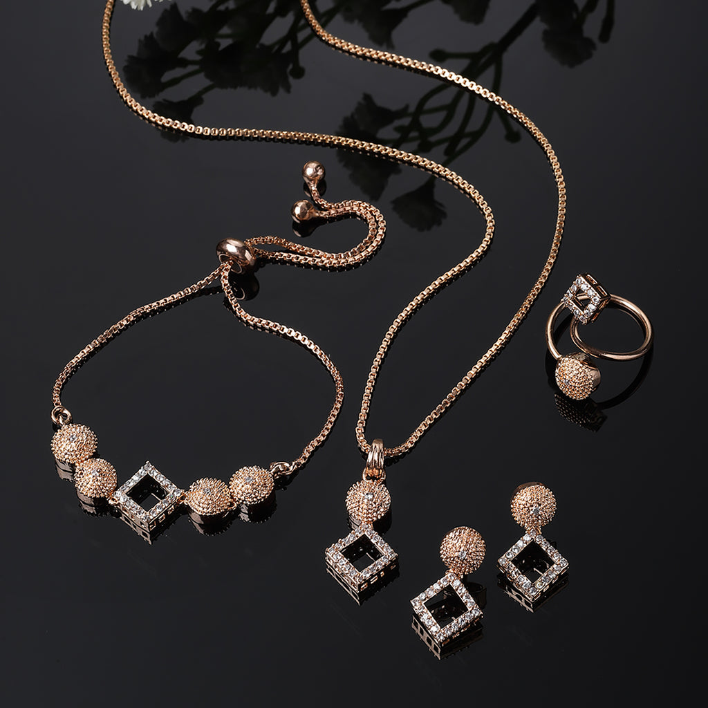 This jewellery set consists of a necklace, a pair of earrings, a ring and a bracelet. Rose Gold-Plated white american diamond studded square shape necklace, has secured with s-hook closure. A pair of matching drop earrings, each secured with a post and back closure. A mataching ring, secured with adjustable closure. A matching bracelet, secured with adjustable drawstring closure.