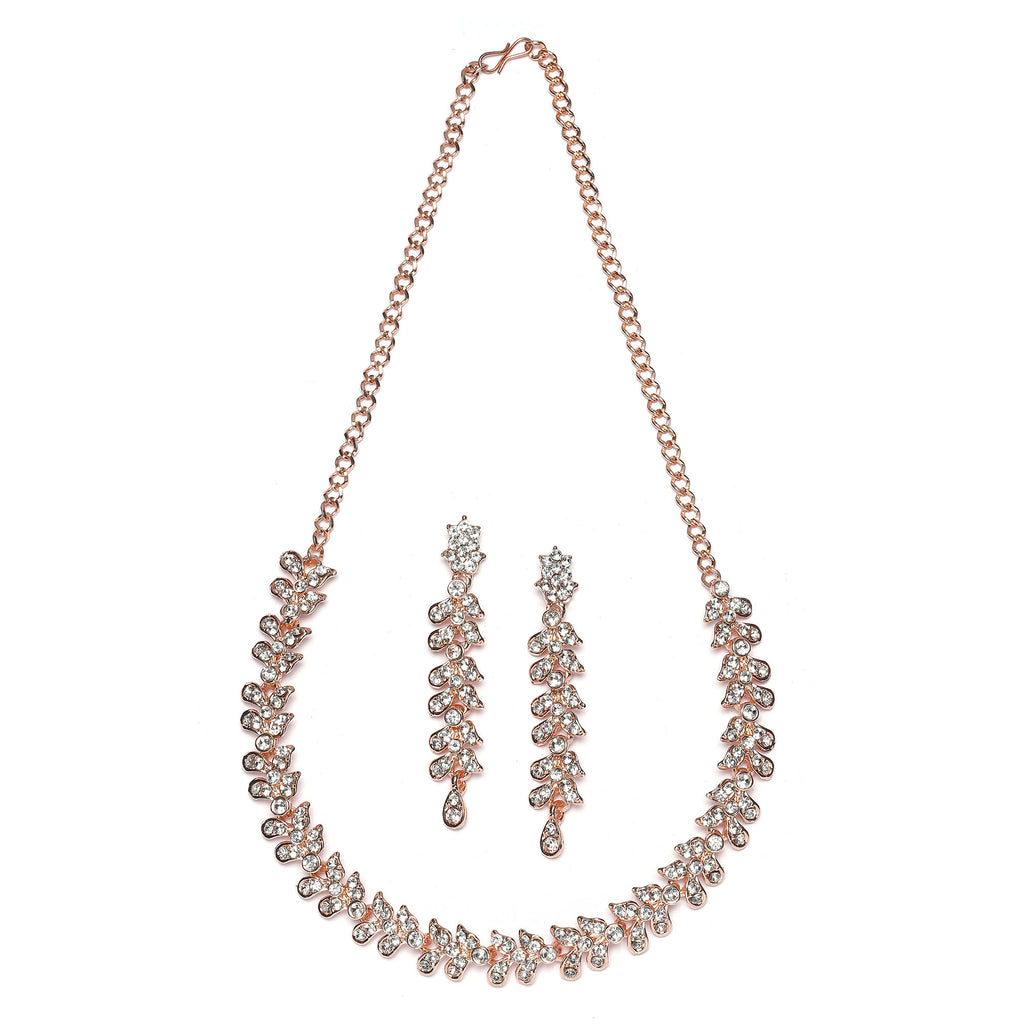 Rose Gold-Plated White Cubic Zirconia Studded Leafy Shaped Necklace with Earrings Jewellery Set