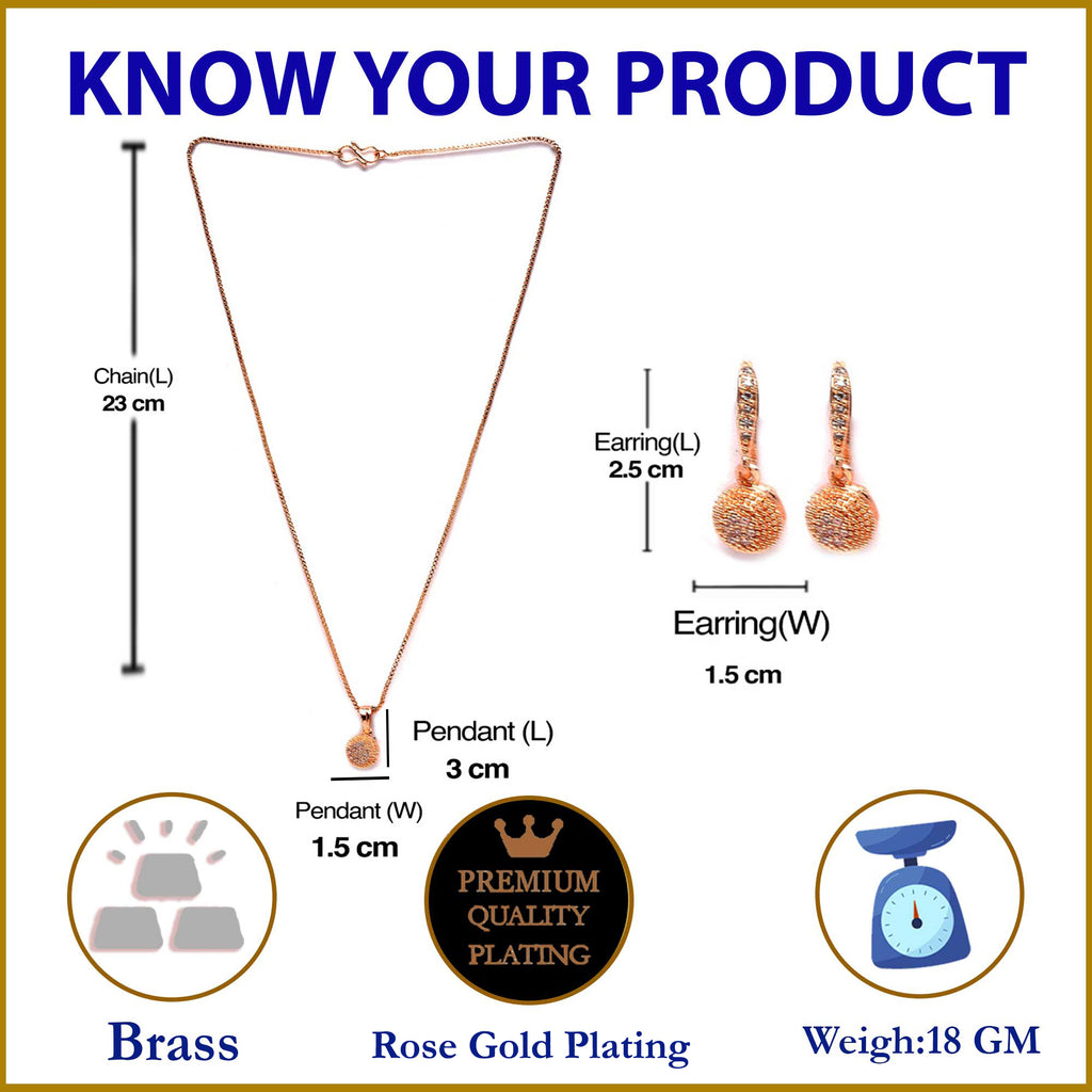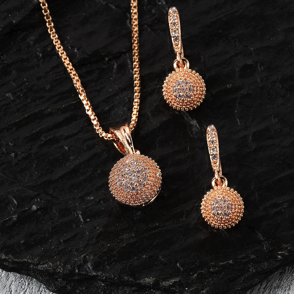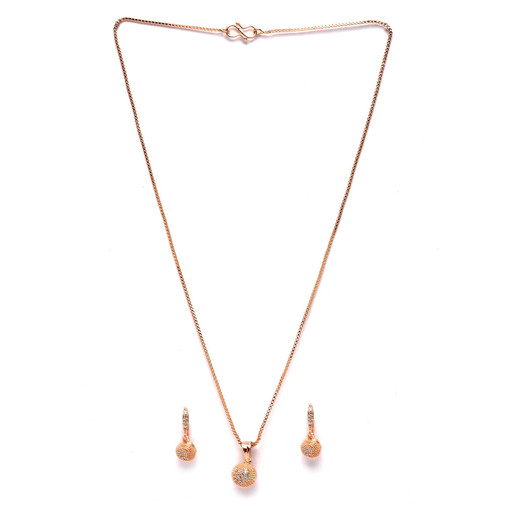 Rose Gold-Plated White Cubic Zirconia studded Round Shaped Pendant with Earrings
