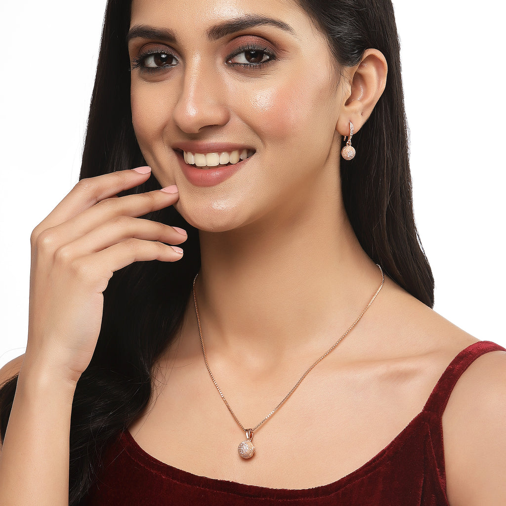 This jewellery set consists of a pendant and a pair of earrings. Rose Gold-Plated white cubic zirconia studded round shaped pendant, secured with s-hook closure. A pair of matching drop earrings, each secured with a post and back closure.