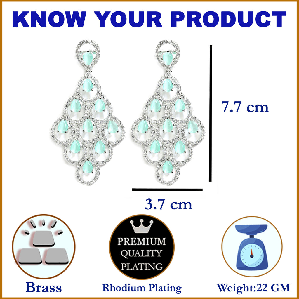 Sea Green American Diamond Rhodium-Plated with Silver-Tone Studded Leaf Shaped Drop Earrings
