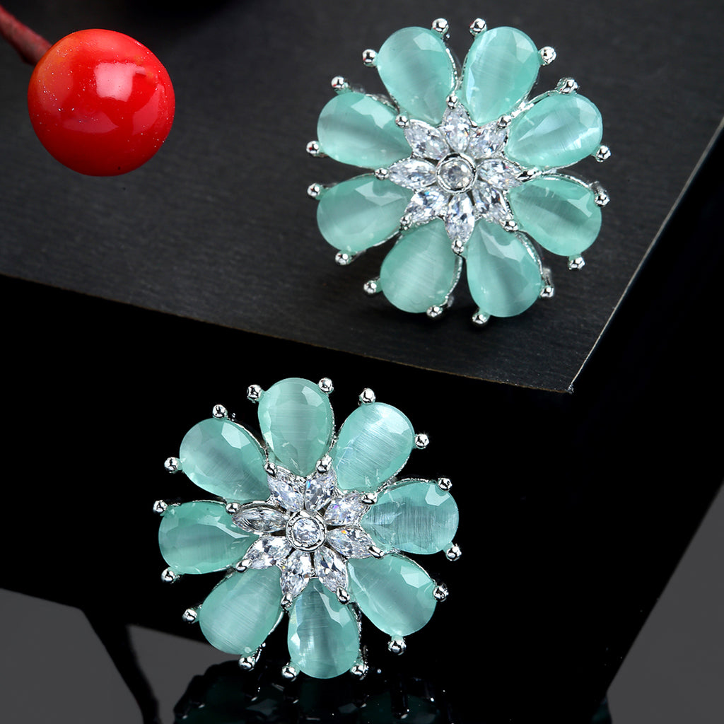 Sea Green American Diamond Studded Floral Shaped Rhodium-Plated with Silver-Tone Studs Earrings
