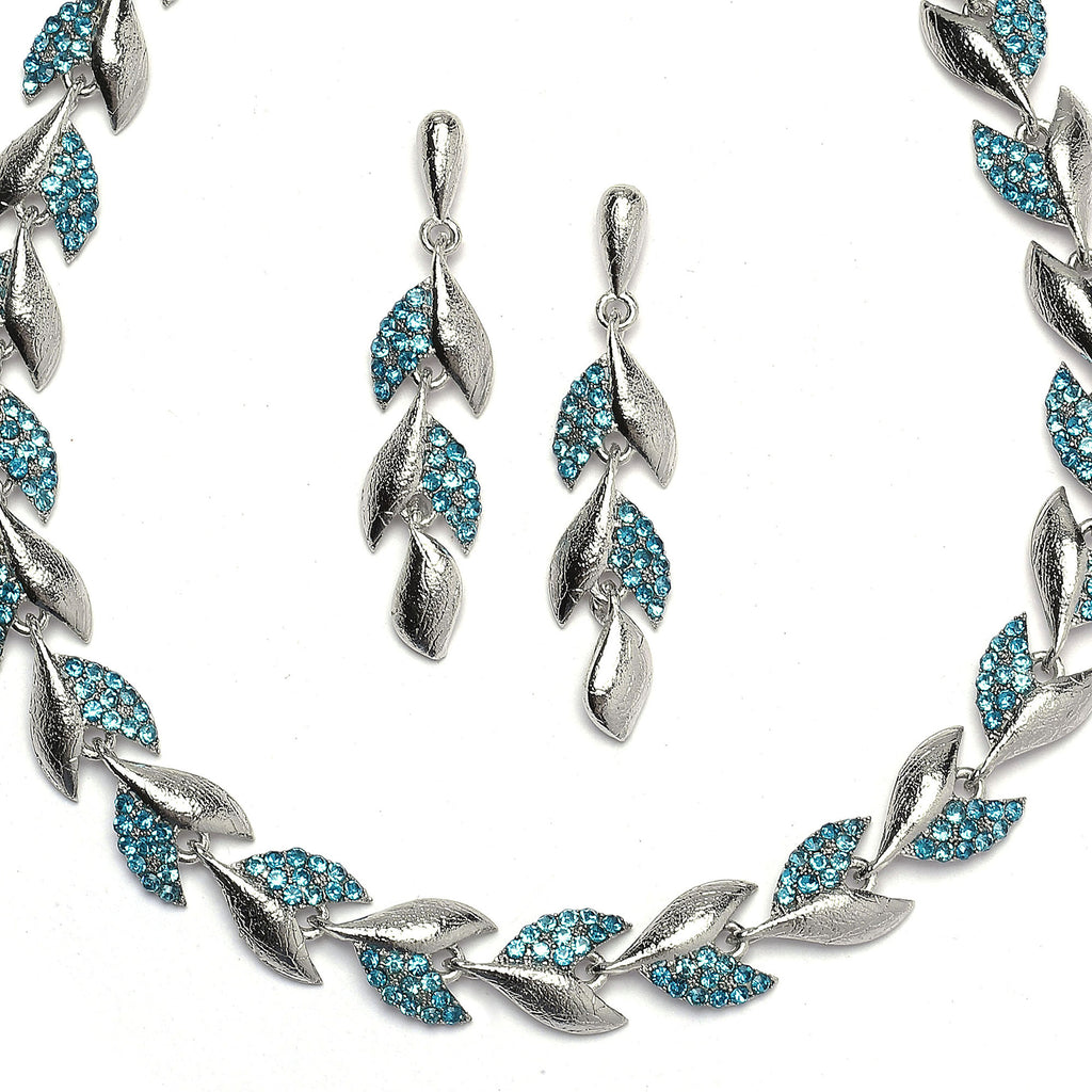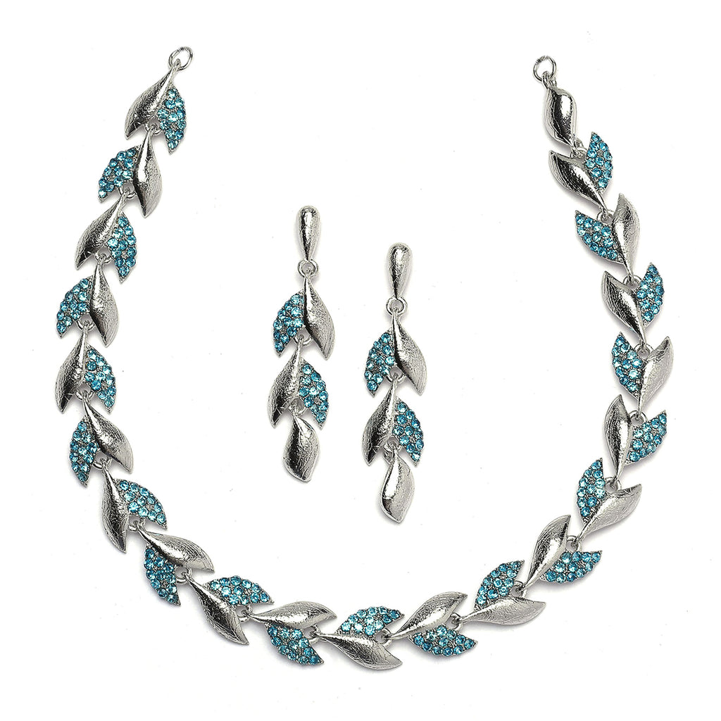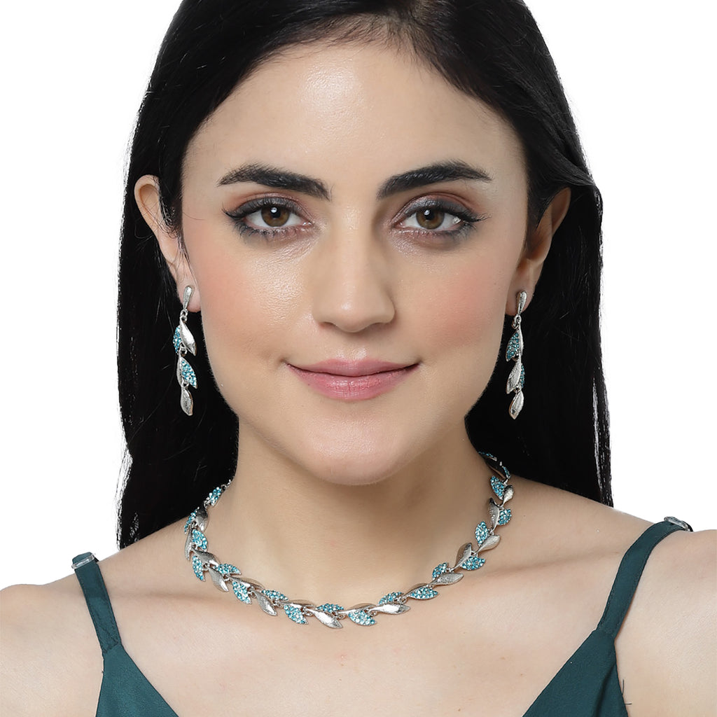 Silver-Plated Blue Cubic Zirconia Studded Leaf Shaped Necklace with Earrings Jewellery Set