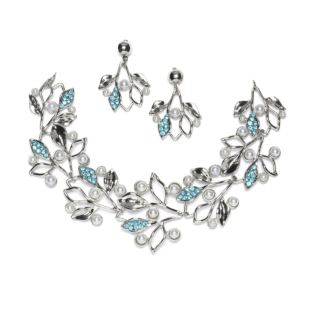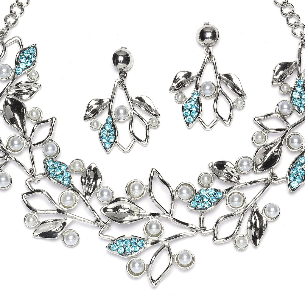 Silver-Plated Blue Cubic Zirconia & White Pearls Studded Leaf Shaped Necklace with Earrings Jewellery Set