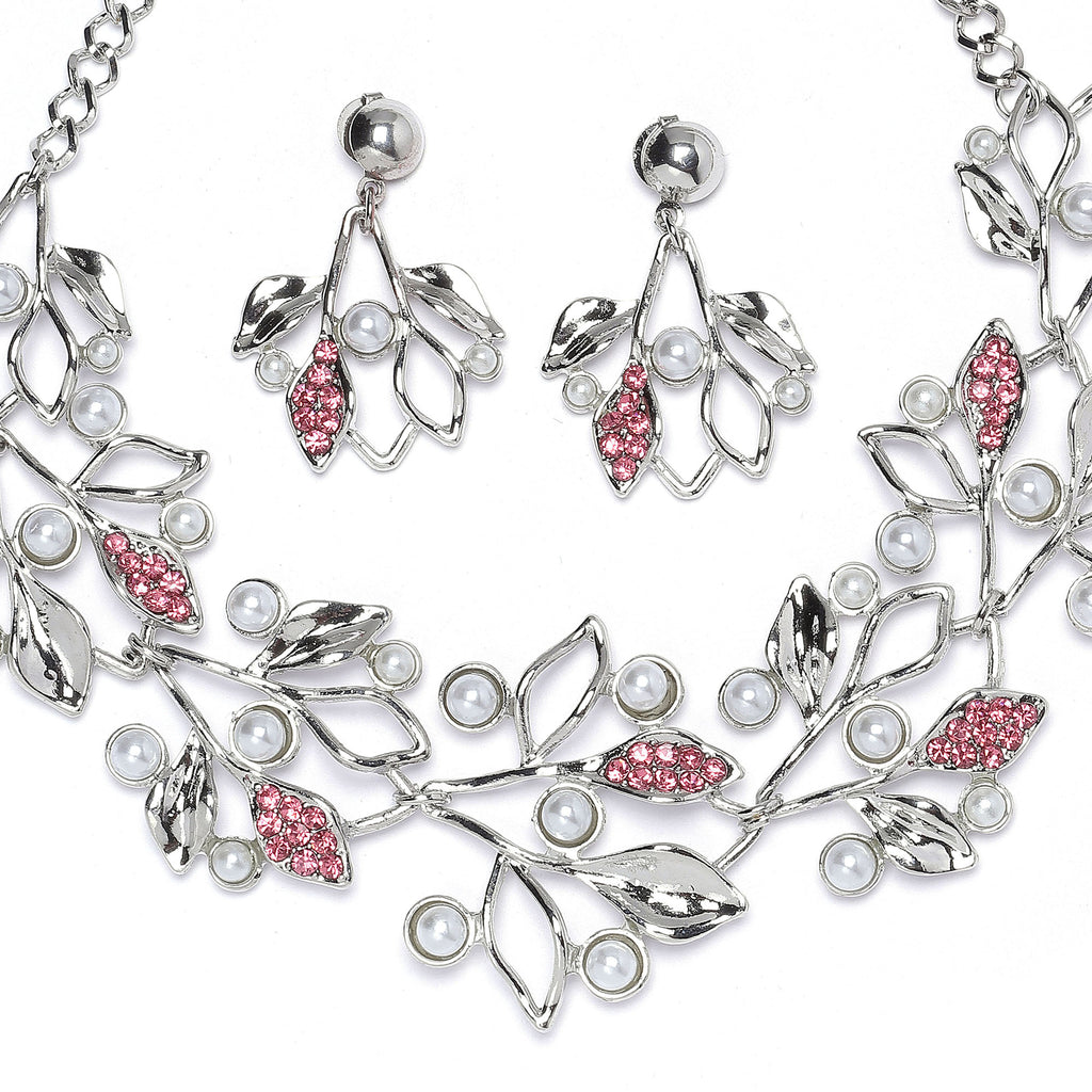 This jewellery set consists of a necklace and a pair of earrings. Silver-Plated pink, white cubic zirconia & white pearl studded leaf shaped necklace, secured with s-hook closure. A pair of matching drop earrings, each secured with a post and back closure.