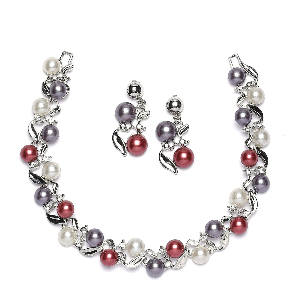 Silver-Plated Red & White Artificial Stones Studded Leafy Shaped Necklace with Earrings Jewellery Set