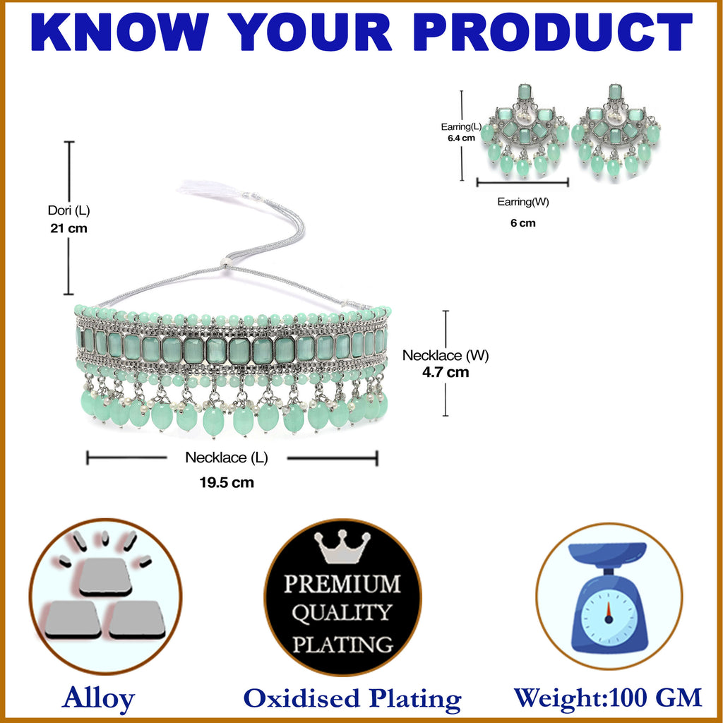 Silver-Plated Sea Green Cubic Zirconia Studded Necklace with Earrings Jewellery Set