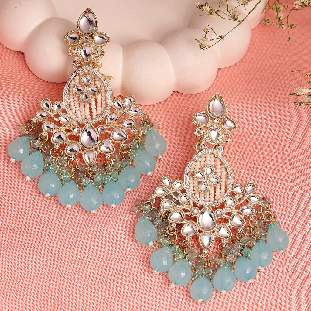 Traditional Gold Plated kundan Studded Blue & White Pearl Beaded Royal Jhumkas