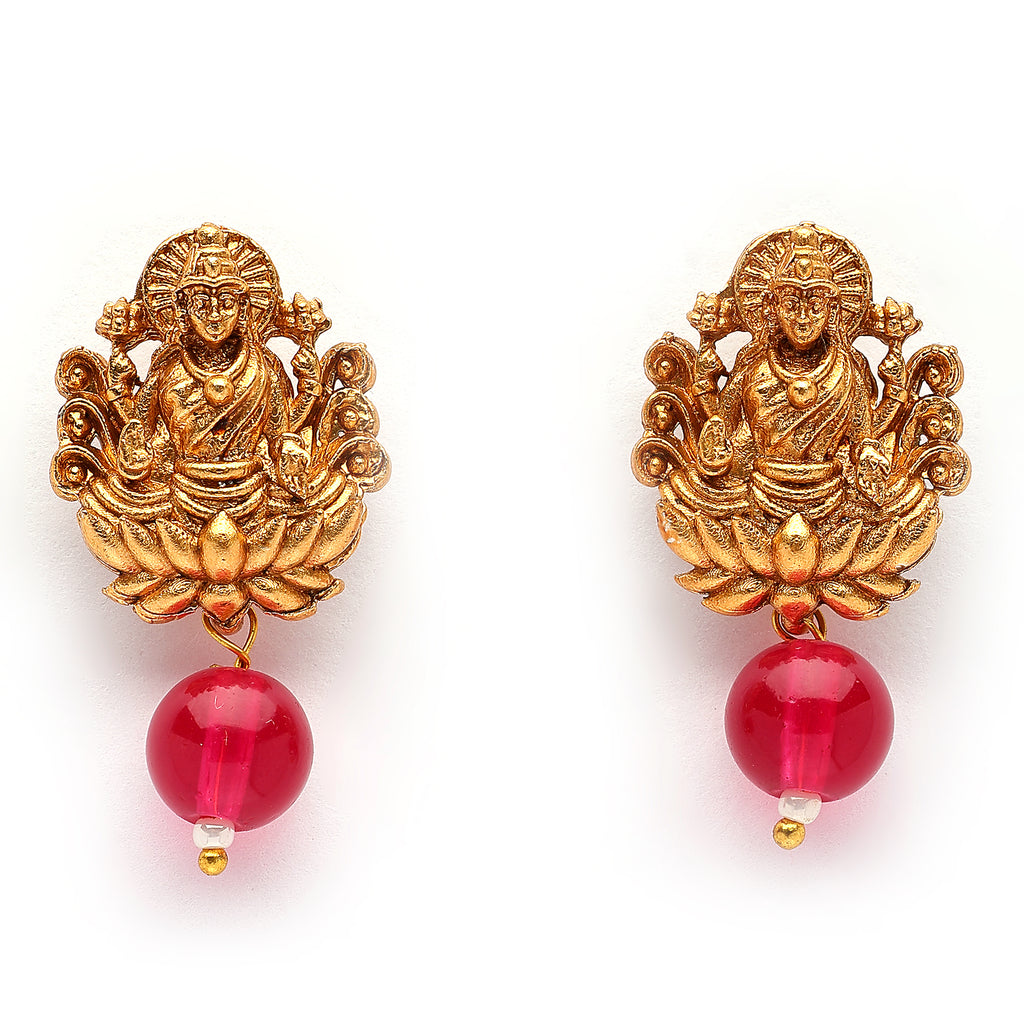 Elegant Design: This gold-plated Goddess Laxmi design pearls and cz studded necklace set boasts a sophisticated traditional design, exuding timeless elegance.