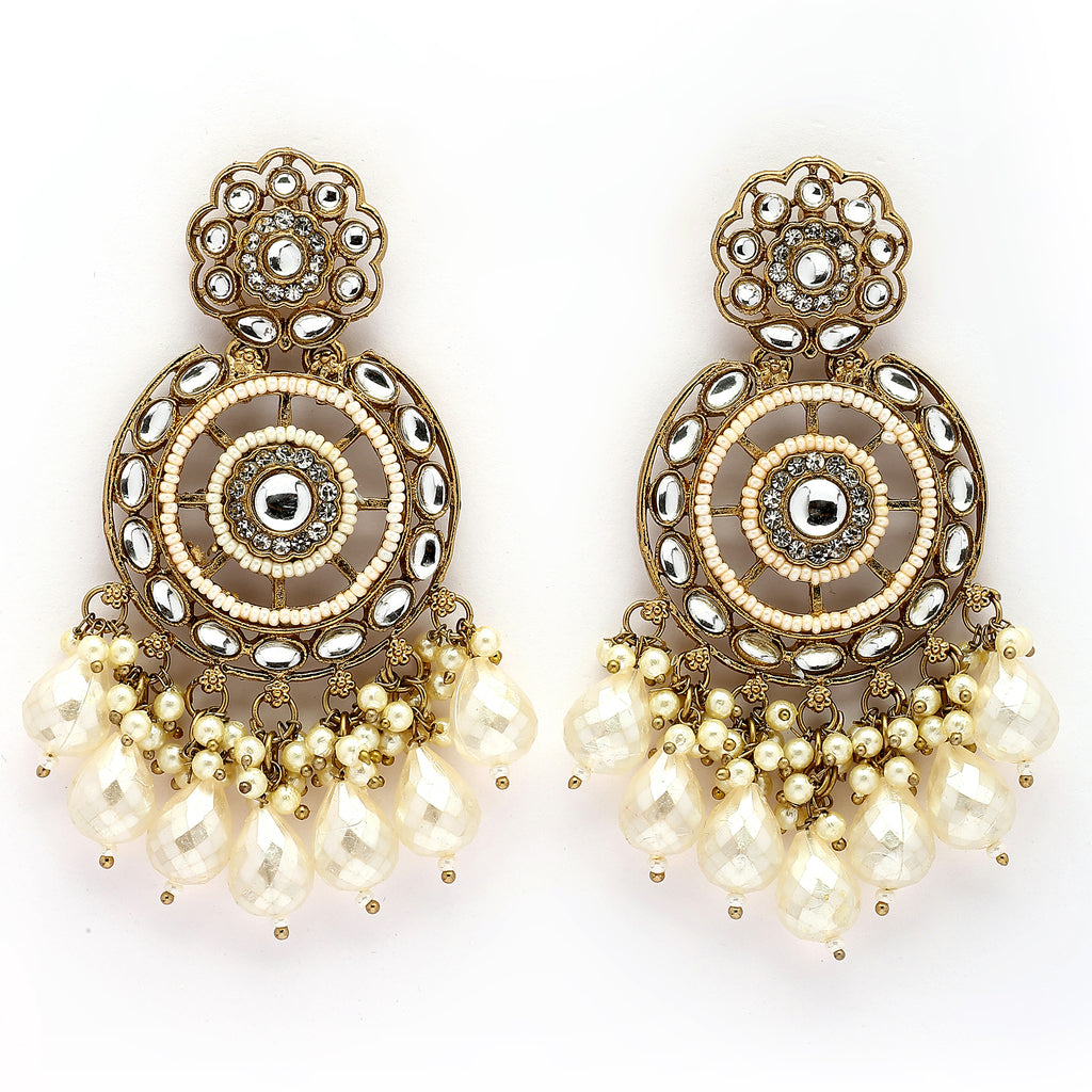 Traditional Gold Plated White kundan Studded Pearl Beaded Royal Jhumkas Earrings