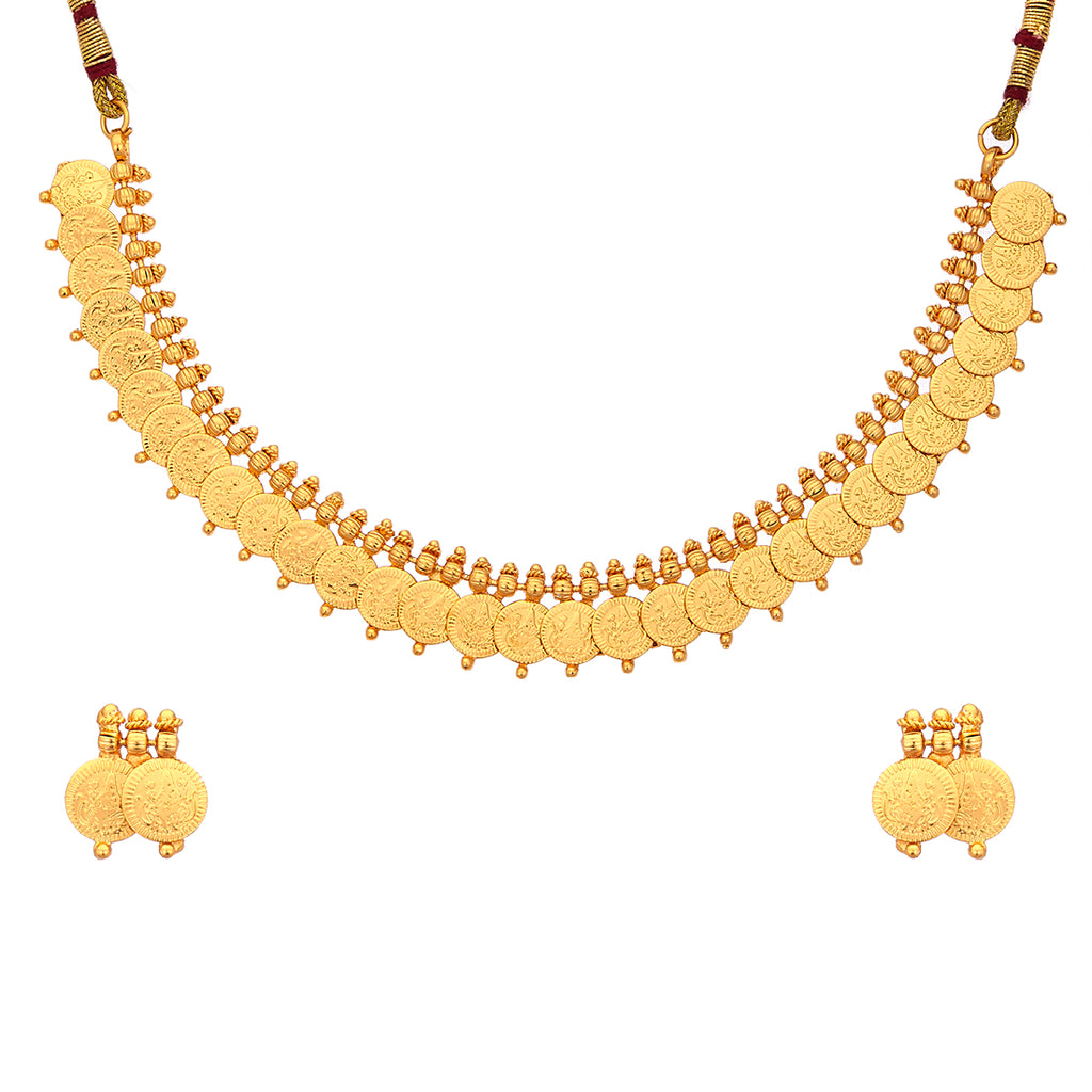 This jewellery set consists of a necklace and a pair of earrings. Gold-plated temple coin necklace, has an intricate textured design detail. Secured with an adjustable drawstring closure. A pair of matching drop earrings, secured with a post and back closure.