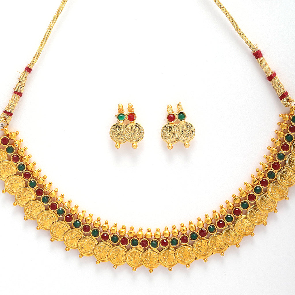Traditional Temple Coin Red Green Small Choker Necklace With Earring Jewellery For Women & Girls