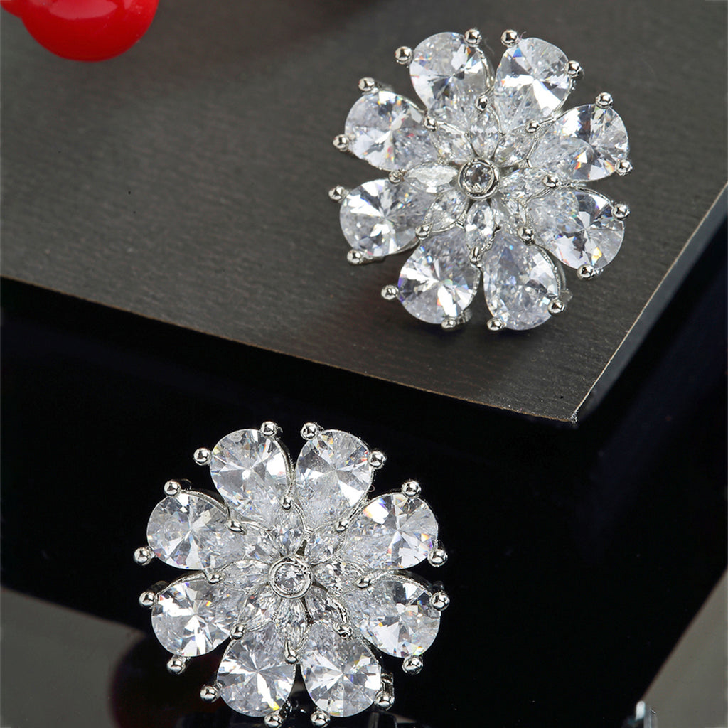 Floral Shaped studs, Rhodium-Plated with Silver-Tone, has american diamond. Secured with a post and back.