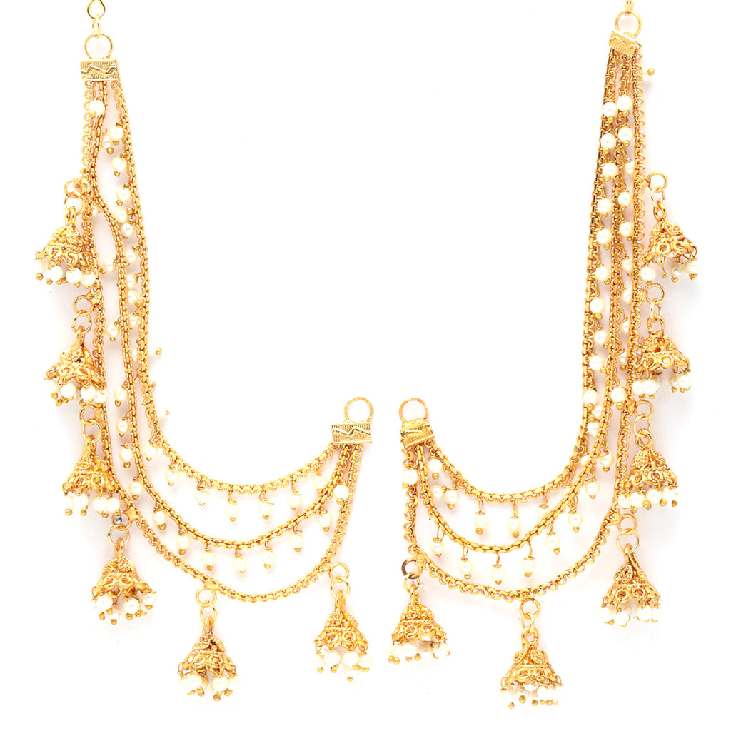 Off white classic jhumkas, gold-plated, has artificial stones and beads. Secured with a fish hook earwire.