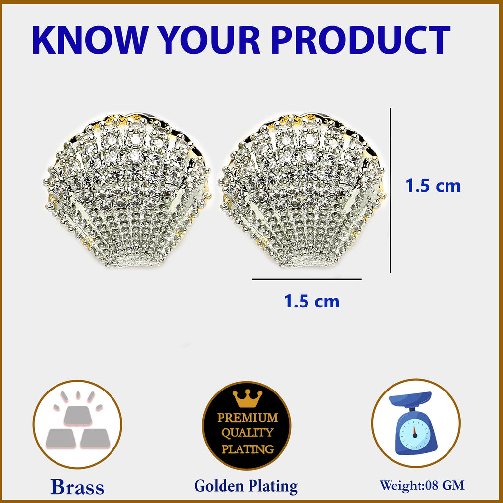 Components: A pair of dazzling small ear cuff earrings plated in gold, studded with sparkling white American diamonds. These earrings are beautifully packaged in a Zeneme jewelry box and include a care card for easy upkeep.