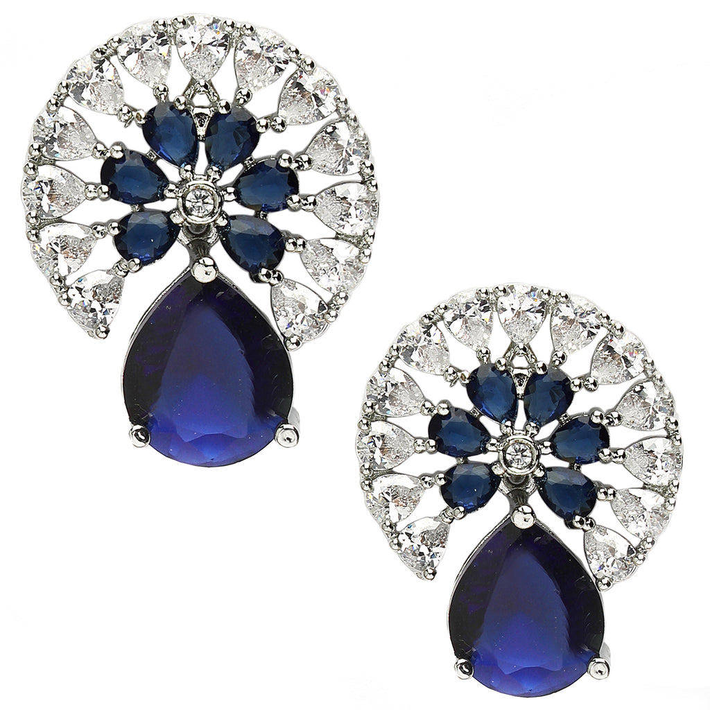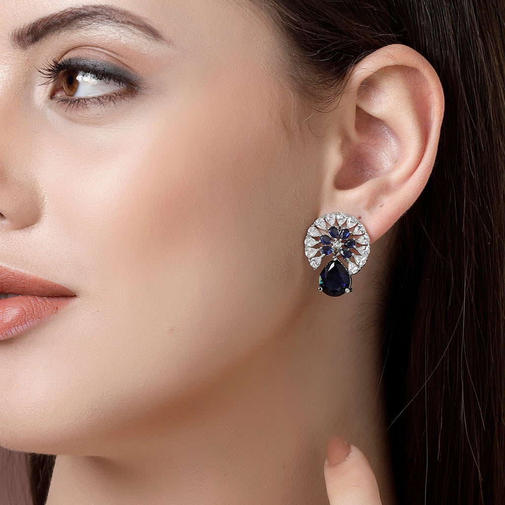 Elegant Design & Craftsmanship: Meticulously crafted, these earrings showcase an intricate arrangement of blue and white American diamonds. The polished rhodium finish adds a sophisticated shine, making them a standout addition to your jewelry collection.