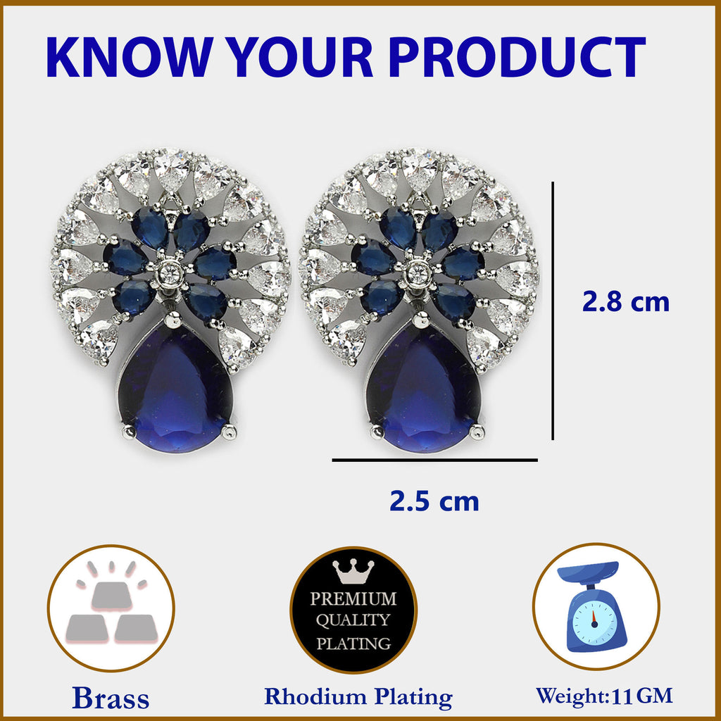 Components: A pair of stunning stud earrings plated in rhodium, designed in a circular shape and adorned with blue and white American diamonds. These earrings are packaged in an elegant Zeneme jewelry box and include a care card for maintenance.