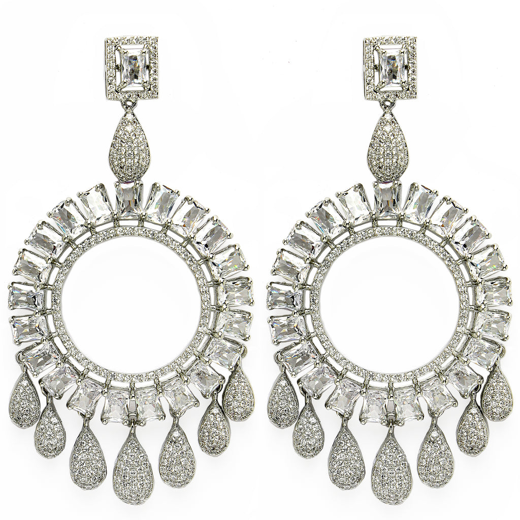 Elegant Design & Craftsmanship: Meticulously crafted with attention to detail, these drop earrings feature a stunning arrangement of white American diamonds set in circular frames. The polished rhodium finish adds a sophisticated shine, making them a standout piece for any occasion.