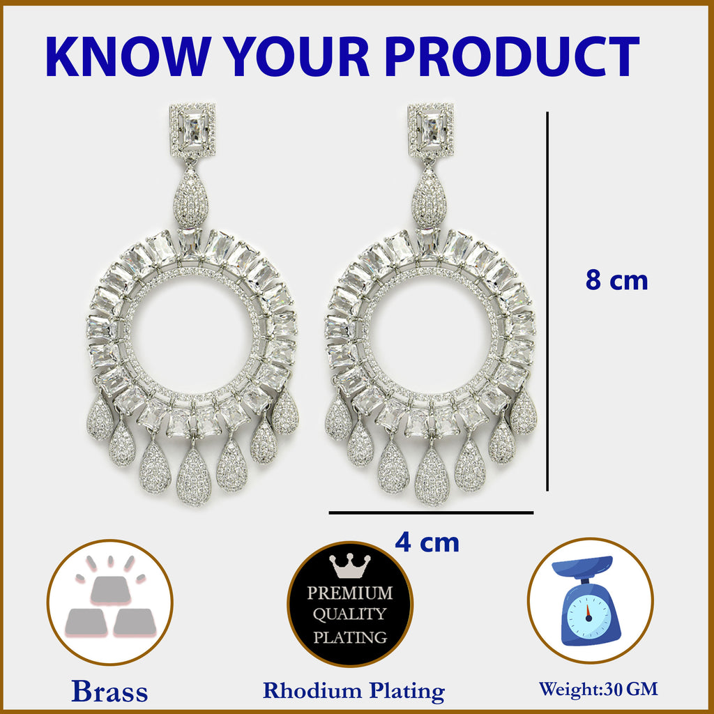 Zeneme American Diamond Drop Earrings: Featuring AAA-grade white American diamonds, these circular-shaped drop earrings are a perfect blend of timeless design and exceptional craftsmanship, enhanced by skin-friendly rhodium plating.