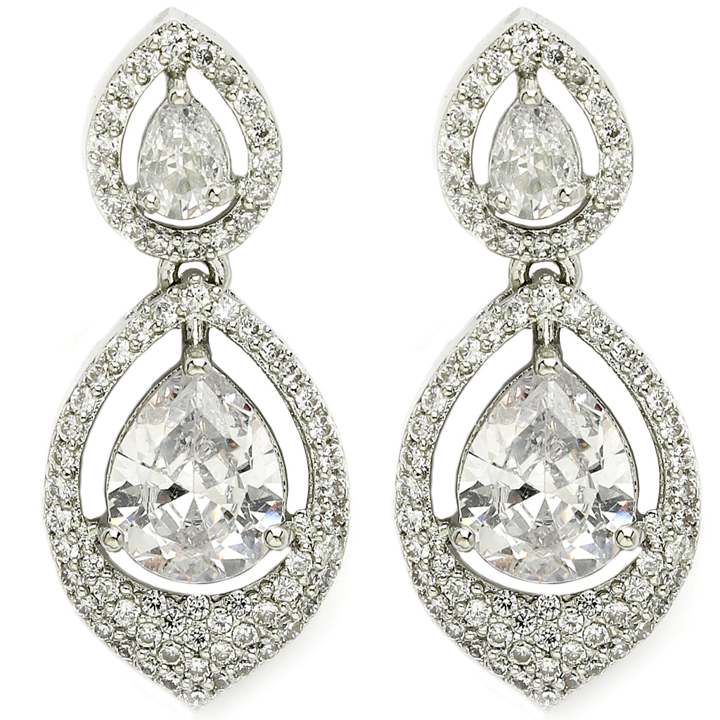 Components: Two tear-shaped American diamond crystals set in a pair of silver-plated drop earrings. These earrings come with a care card and are presented in a charming Zeneme jewelry box.
