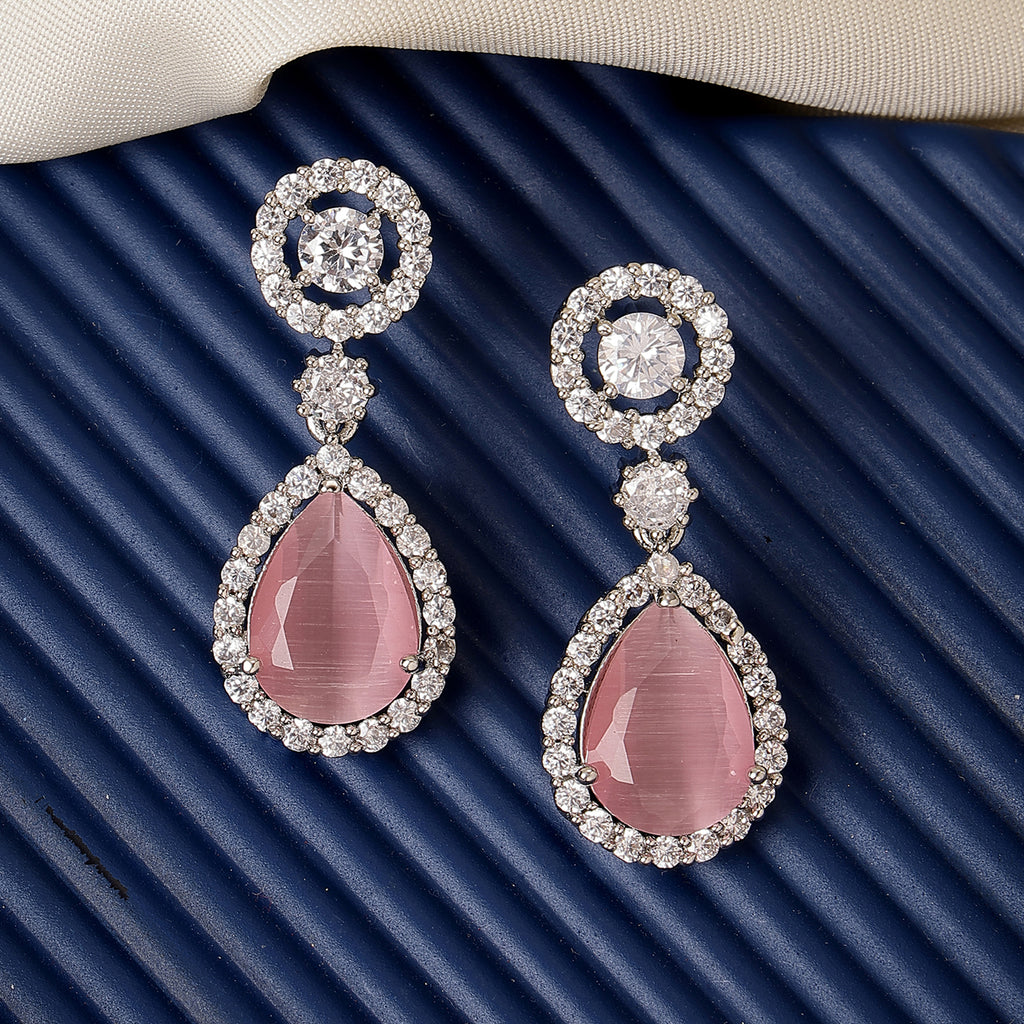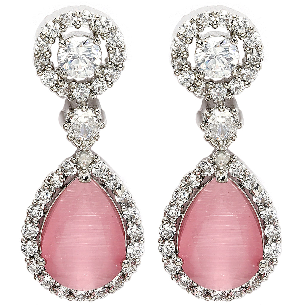- Components: A pair of silver-plated stud earrings featuring tear-shaped American diamond crystals. These earrings are packaged in a cute Zeneme jewelry box with a care card included.