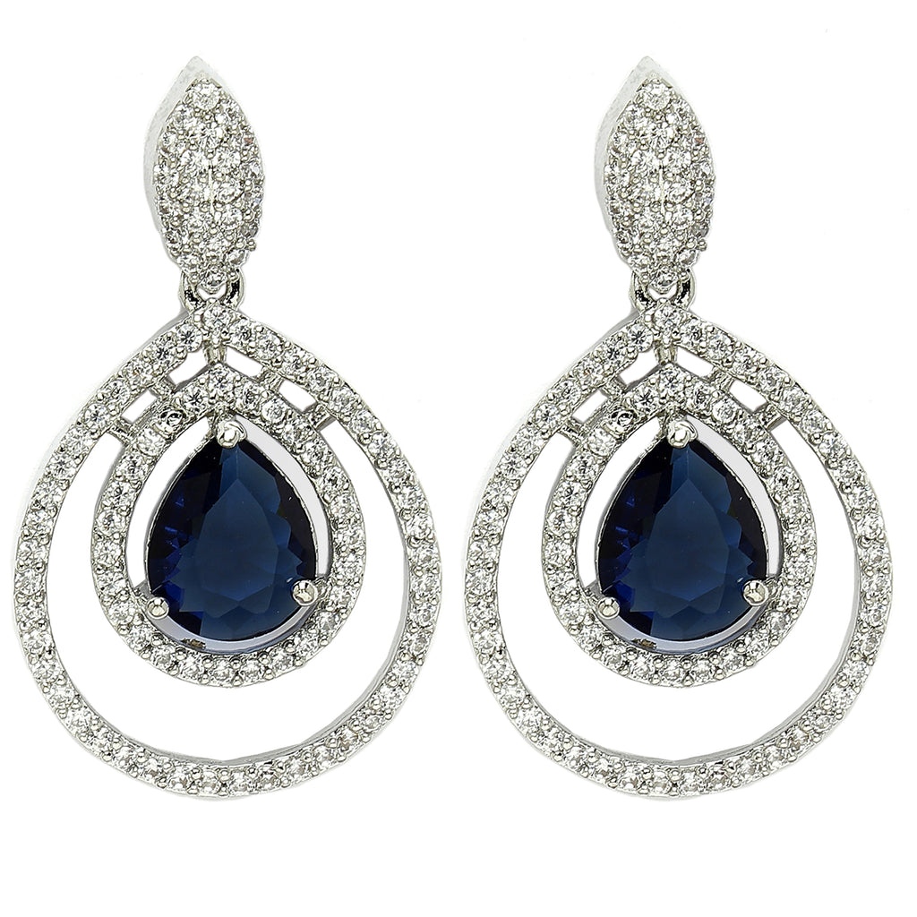 Components: A pair of silver-plated stud earrings featuring dual tear-shaped American diamond crystals. These earrings are packaged in a cute Zeneme jewelry box with a care card included.
