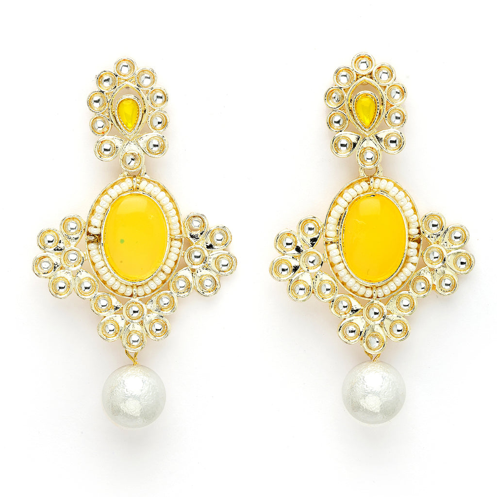 Design: These earrings showcase a traditional design with intricate gold plating, floral patterns, and a central oval Yellow stone. They are accented with sparkling white stones and feature a dangling pearl drop, adding a graceful and timeless touch.