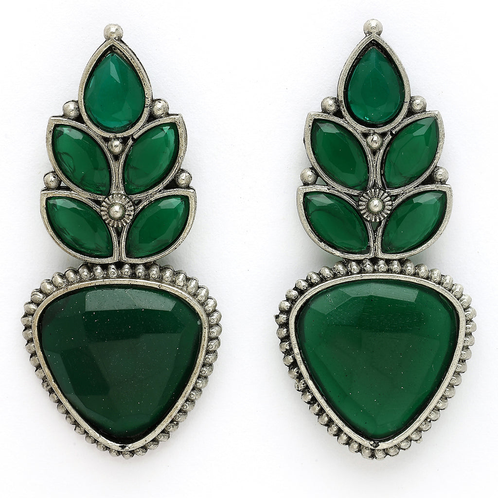 - Design: These earrings have a beautifully intricate design, combining floral and geometric shapes. The upper part features several petal-like stones in a Green hue, arranged in a layered, flower-like pattern. Below them, a large triangular soft pink stone is surrounded by delicate metallic detailing, enhancing the overall elegance.