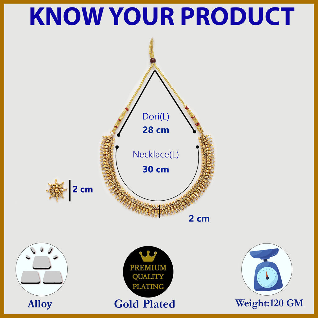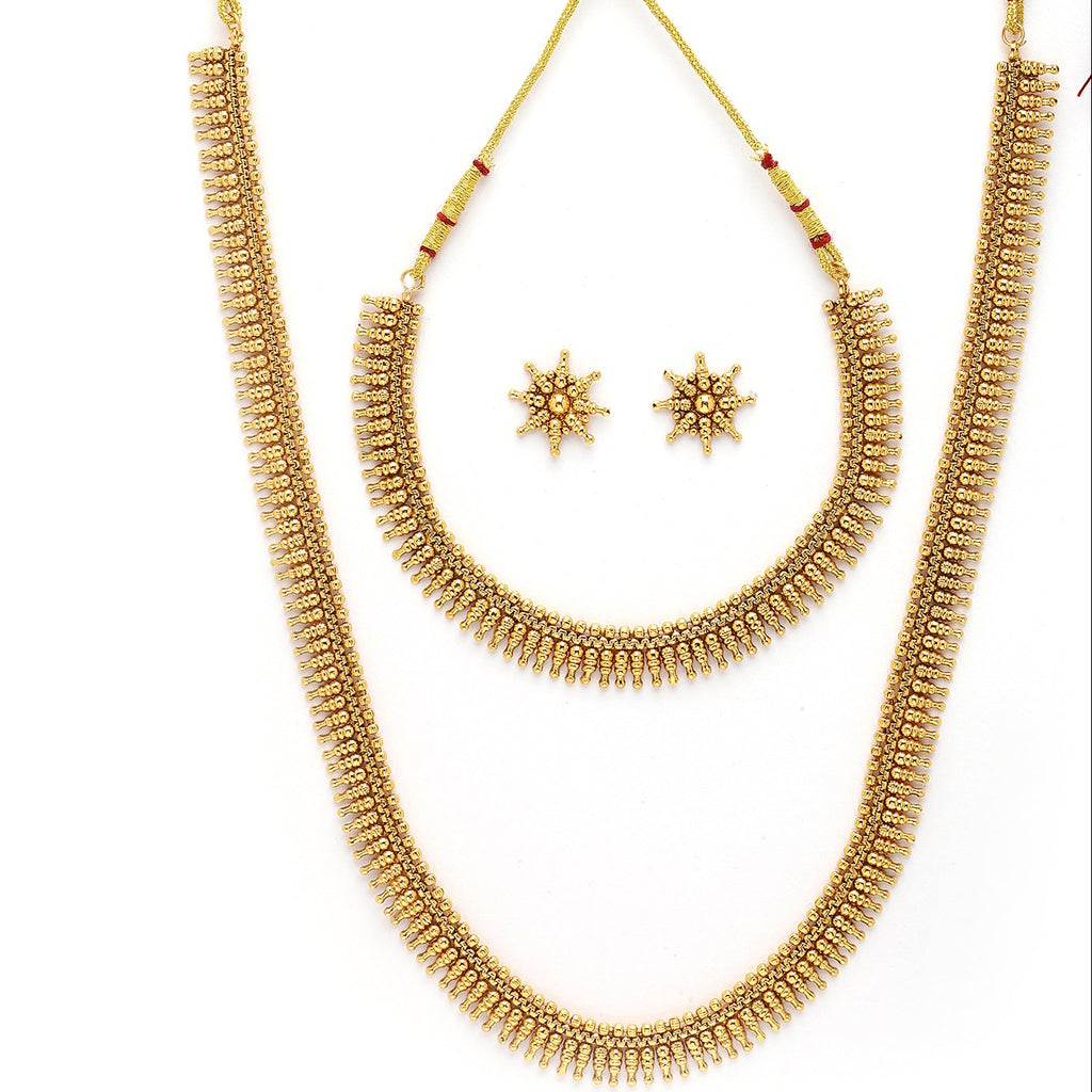Elegant Traditional Design: This exquisite gold-plated jewellery set features a stunning long necklace and matching earrings inspired by traditional temple designs.