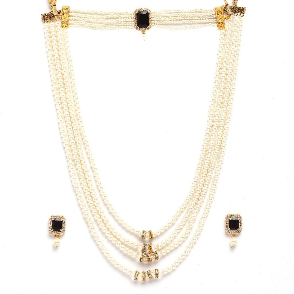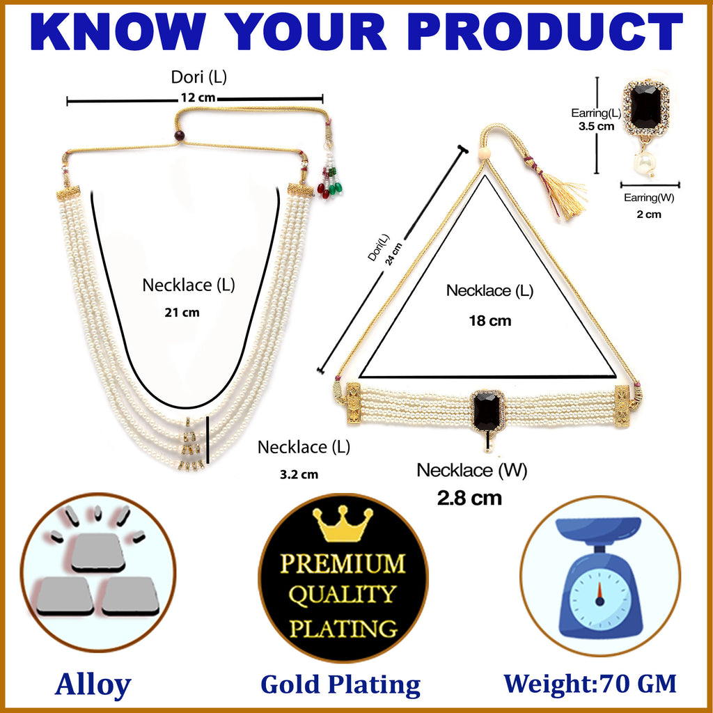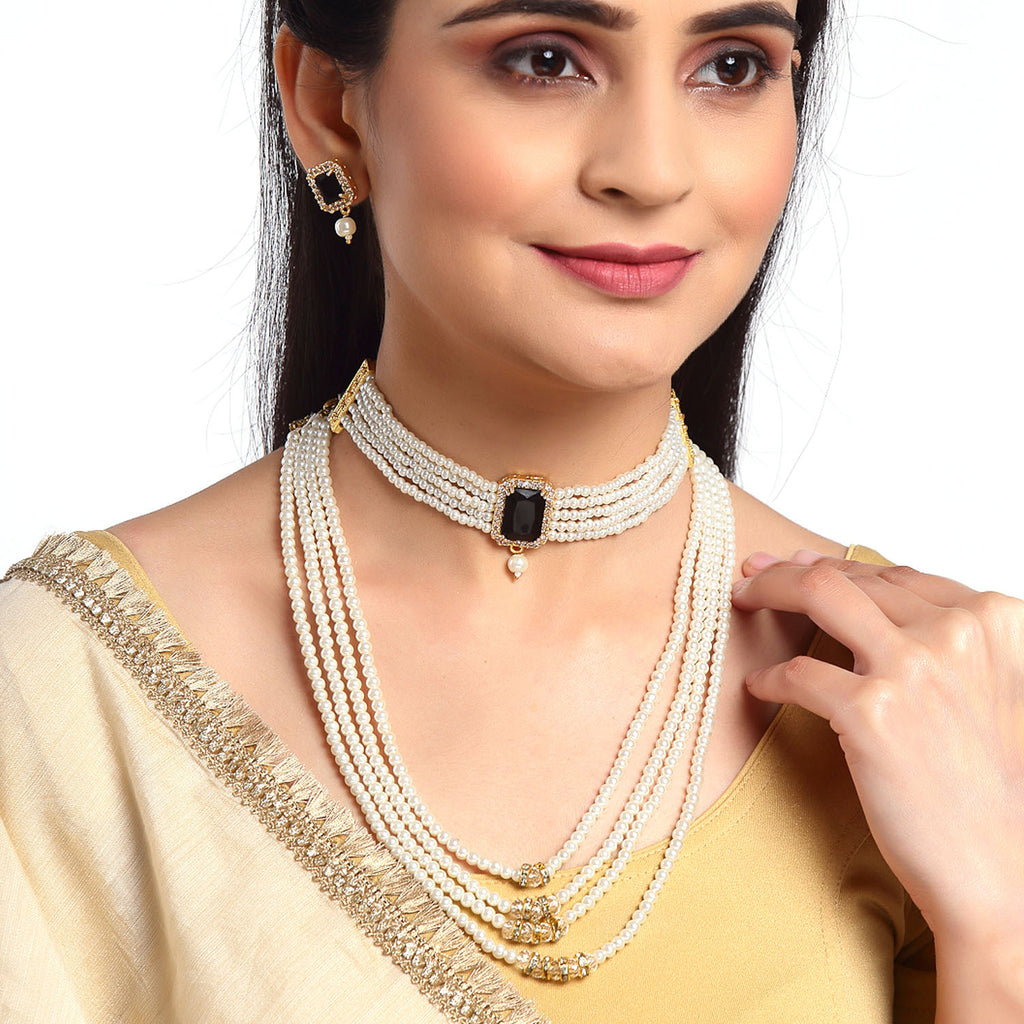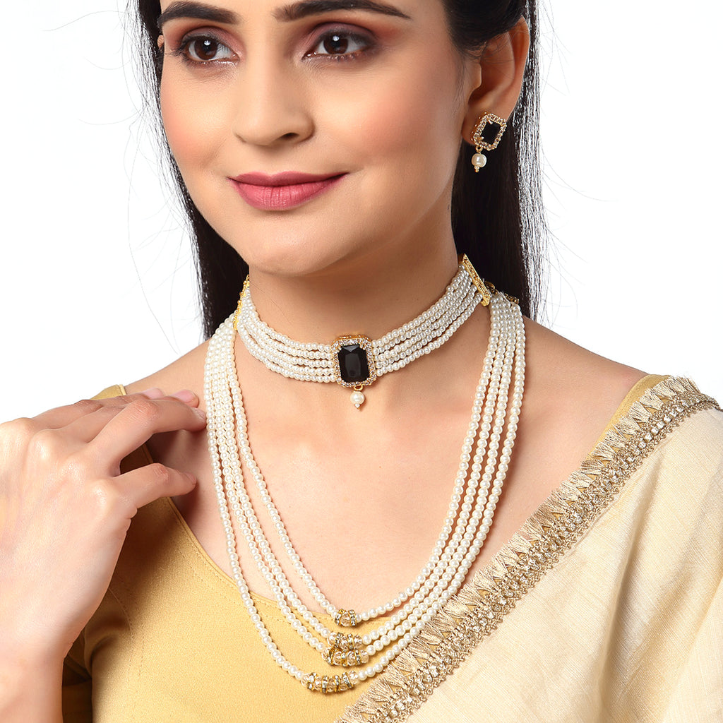 This jewellery set consists of a short necklace, long necklace and a pair of earrings. Gold-Plated short necklace, has black stones-studded and white beaded details, secured with a drawstring closure. Gold-Plated long necklace, has black stones-studded and white beaded details, secured with a drawstring closure. A pair of matching earrings, each secured with a post and back closure.