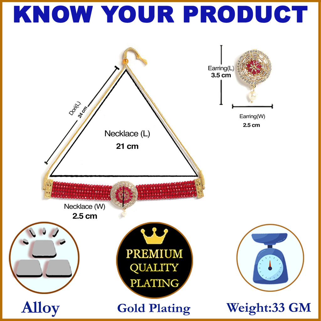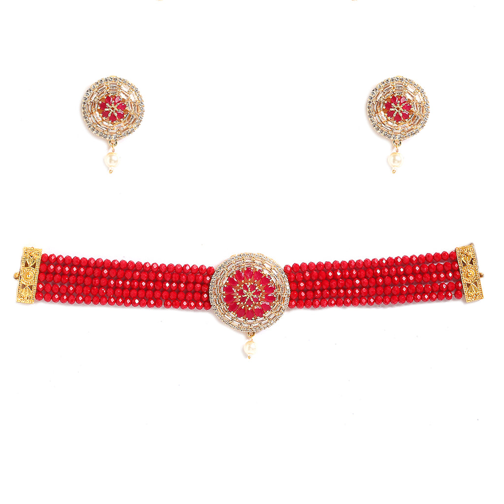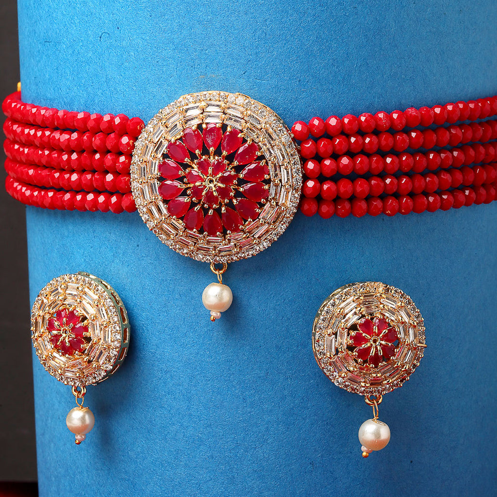 This jewellery set consists of a necklace and a pair of earrings. Gold-Plated Red American Diamond Studded Transparent Stone Detailing Pendant With Multistrand Red Beads Strap Choker Necklace, has a drawstring closure. A pair of matching Red American Diamond Stone Studded studs, secured with a post and back closure.