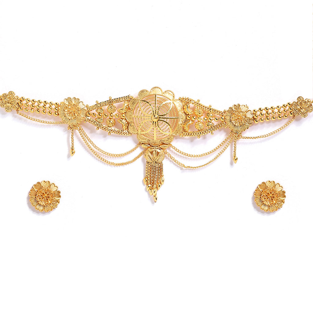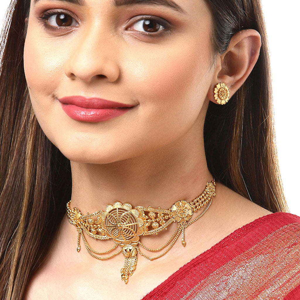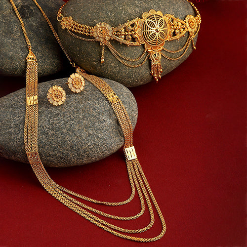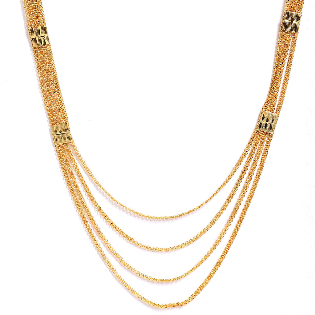 This jewellery set consists of a short necklace, long necklace and a pair of earrings. Gold-Plated short necklace, has textured details, secured with a drawstring closure. Gold-Plated multi layered long necklace, has textured detail, secured with a drawstring closure. A pair of matching earrings, each secured with a post and back closure.