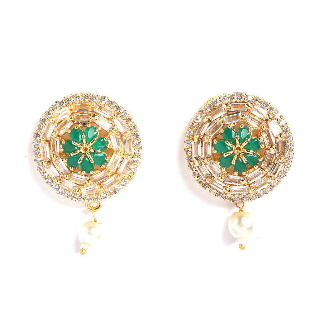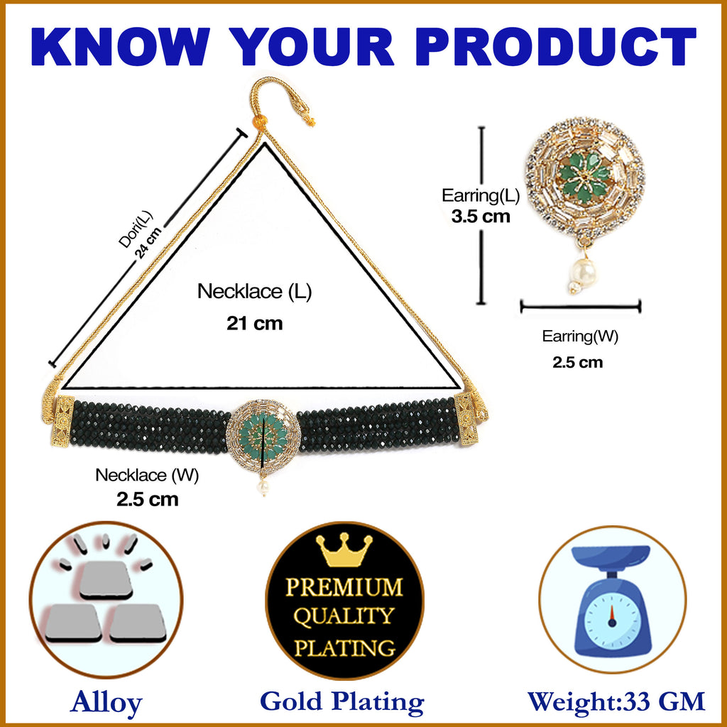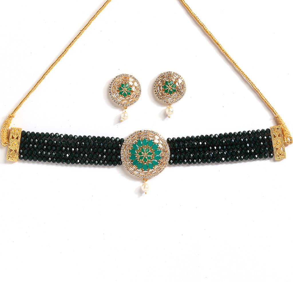 This jewellery set consists of a necklace and a pair of earrings. Gold-Plated green with transparent stone studded detailing pendant with multistrand dark green beads strap choker necklace, has a drawstring closure. A pair of matching red and green stone studded studs, secured with a post and back closure.