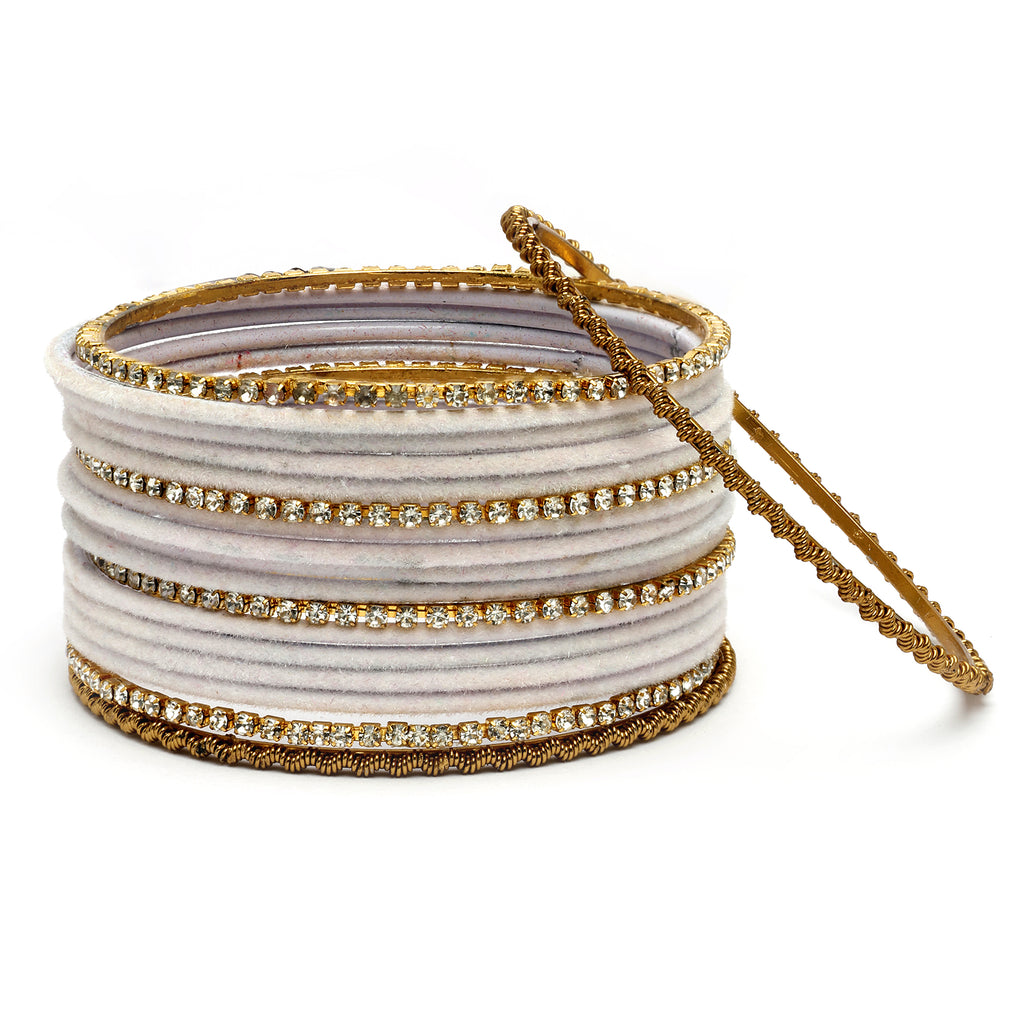 Elegant Design: Elegant bangle set featuring matte finish Lavender velvet, gold-tone metal accents, and stone-studded bangles. This set blends tradition with a modern pastel touch