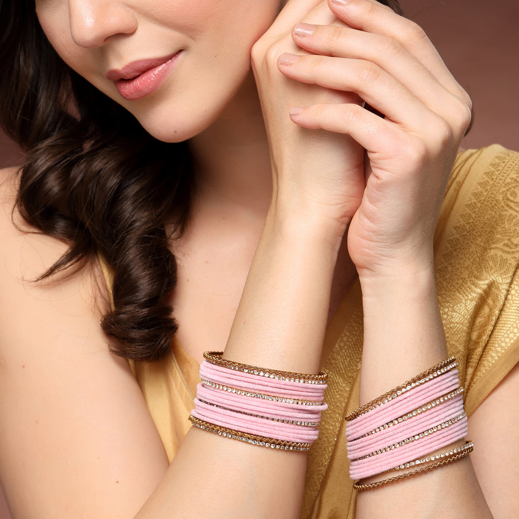 Elegant Design: Elegant bangle set featuring matte finish Pink velvet, gold-tone metal accents, and stone-studded bangles. This set blends tradition with a modern pastel touch