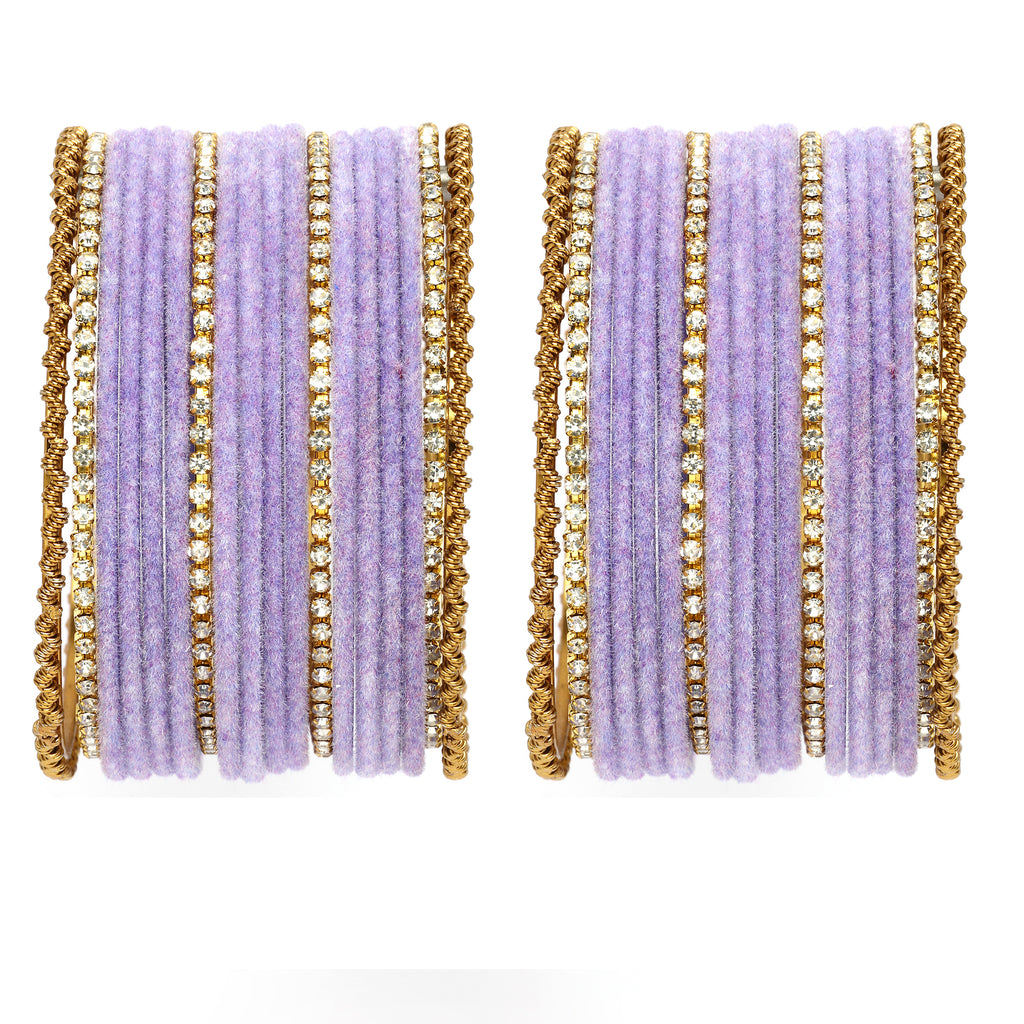 Elegant Design: Elegant bangle set featuring matte finish Violet velvet, gold-tone metal accents, and stone-studded bangles. This set blends tradition with a modern pastel touch