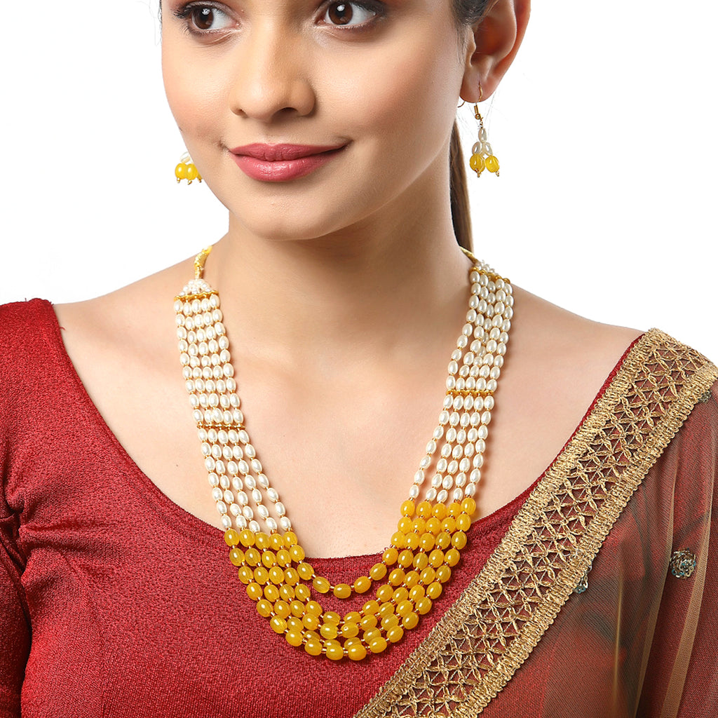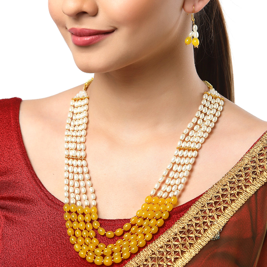 Gold-Plated Off-White & Yellow Pearl Beaded 5-Layered Jewellery Set